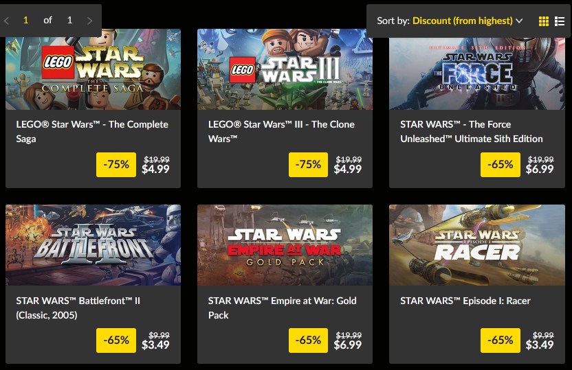 Итак, распродажа уже в полном разгаре, и до вечера 5 мая в GOG можно найти большое количество классических игр франшизы Star Wars. Скидки в этот раз совсем не маленькие, и достигают 75 процентов.