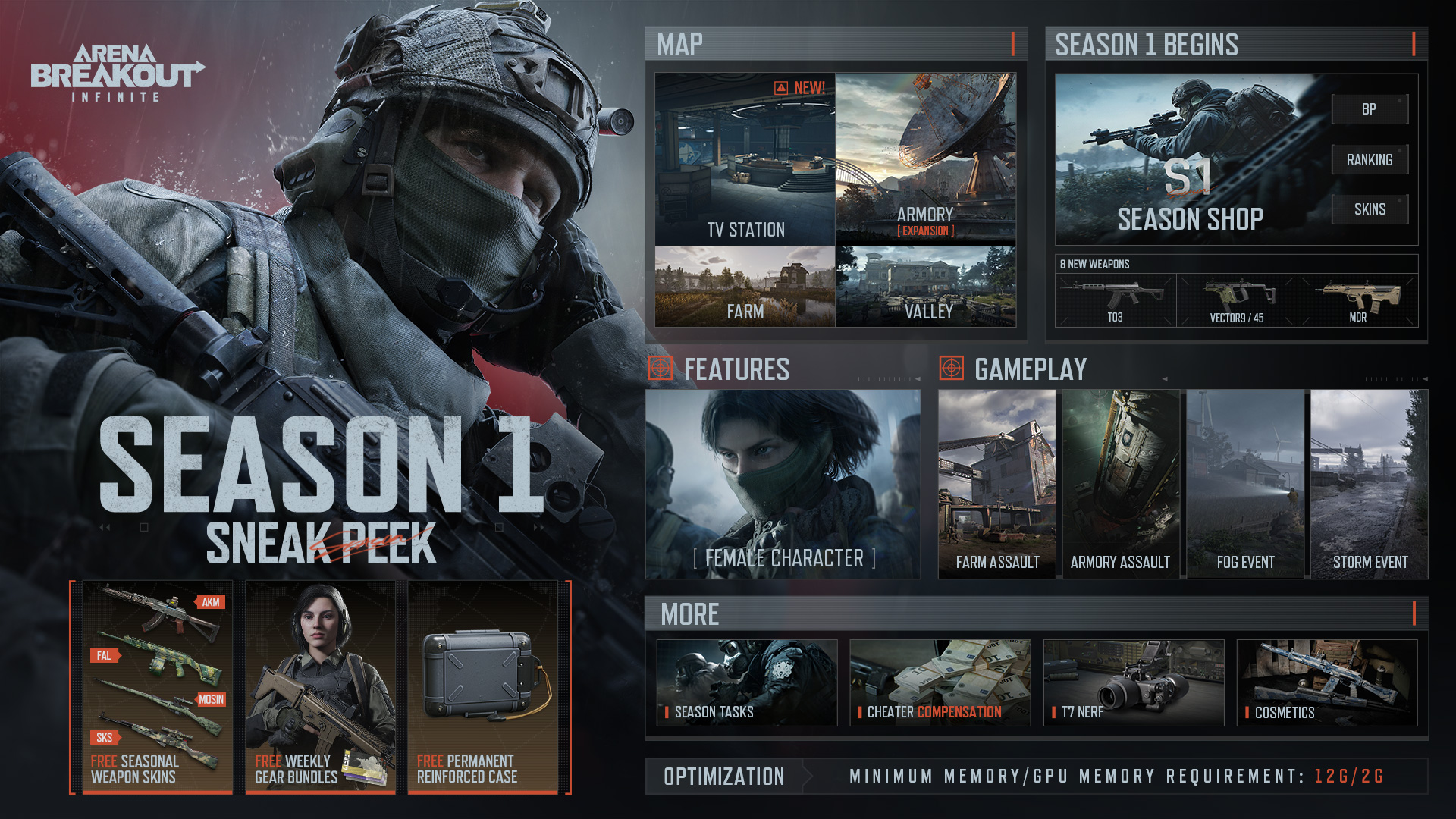 Разработчик Morefun Studios в ходе расширенной демонстрации контента первого сезона, объявил, что первый сезон тактического симулятора Arena Breakout: Infinite начнется в ноябре. С первым сезоном игра получит новую карту «Телестанция» и расширение существующей карты «Арсенал», 8 новых видов оружия, оператора женского пола, улучшение античита, первый сезонный абонемент и оптимизацию для слабых ПК.