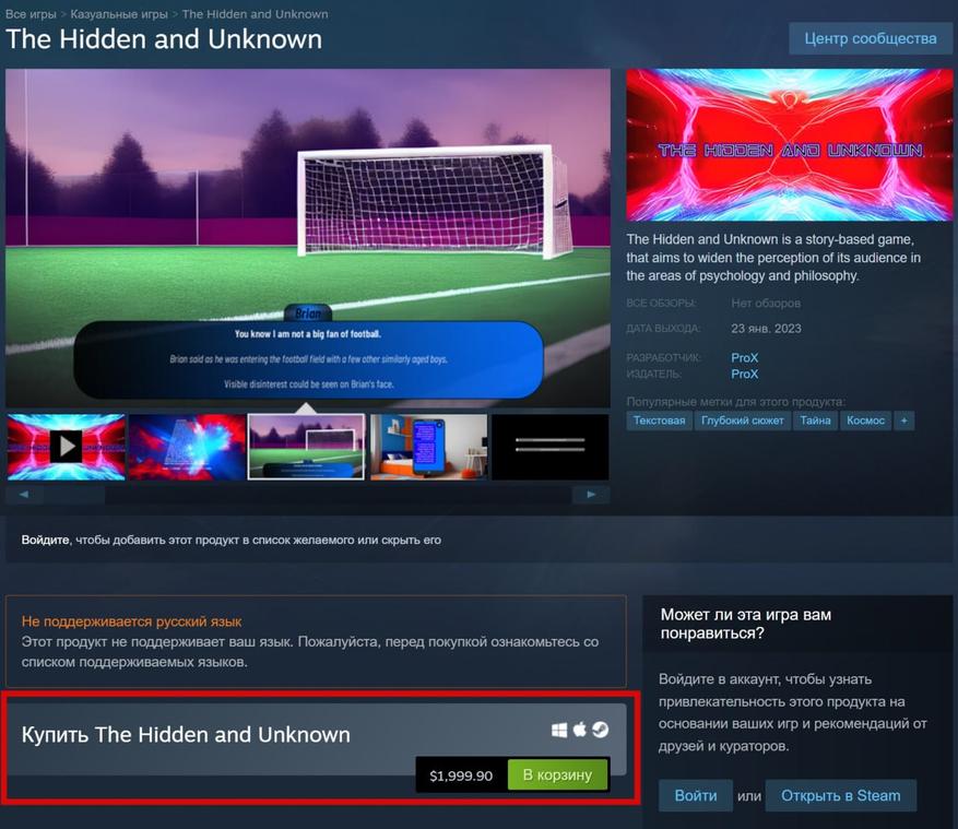 Проект называется The Hidden and Unknown и в российском регионе Steam он продаётся за 65 000 рублей, а в западных регионах его стоимость составляет аж 2000 долларов!