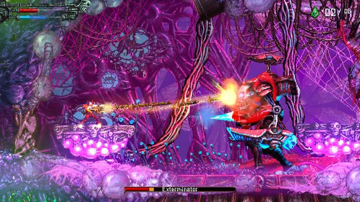 Механика боя напоминает переплетение из Contra, Blasphemous и подобных последнему боевых платформеров нашего времени, где разрешено парирование атак. Наш металхед способен растирать врагов на паштет залпами дальнобойного оружия, либо реализовывать качественную нарезку ломтями в ближнем бою. Оба метода способны эффективно устранять цели при условии своевременной прокачки используемого инструмента.