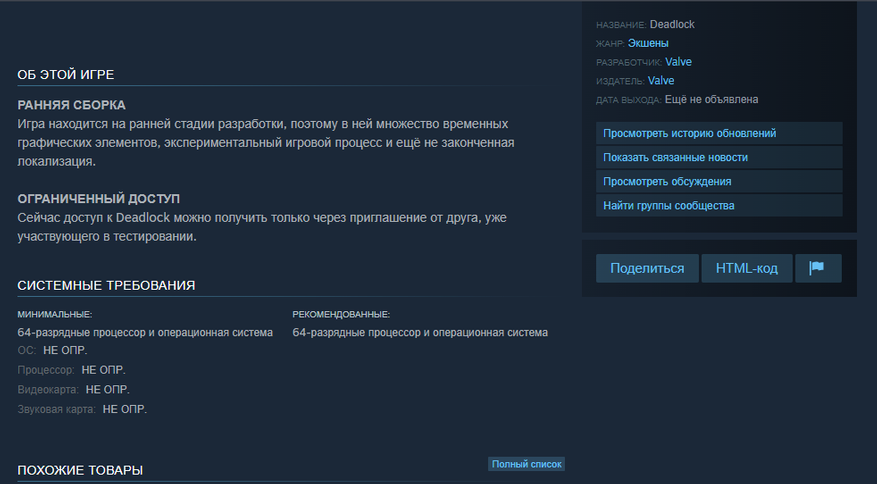 На данный момент дата выхода Deadlock не определена. Также остаются неизвестными и системные требования игры, что прямо указывает на очень раннюю стадию разработки.