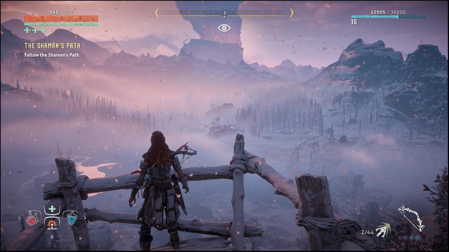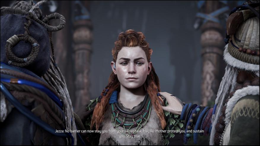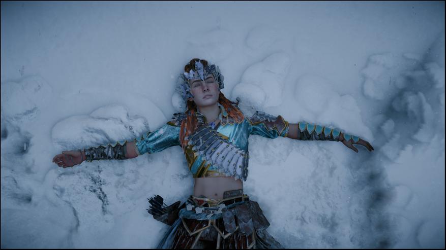 Чем ещё дополнение запомнилось — так это возможностью генерировать скриншоты, от которых сам как будто мёрзнешь. Например, есть одёжка с высокой защитой от огня, которая при этом имеет вид «топик и юбка». В бою с последним боссом я как раз это дело на Элой нацепил, потому что босс огнём активно и плюётся. И тут по ходу ролика Элой вылетает прямо в снег и метель. Ух! Ну и шаманы племени Банук, которые в любой буран разгуливают в одних штанах и непонятных шапках, ярко сигнализируют, что игру делали в Нидерландах. Не знаю уж, насколько уместной была бы механика замерзания хоть в каком-то виде, но за Элой прямо-таки становится холодно иногда.