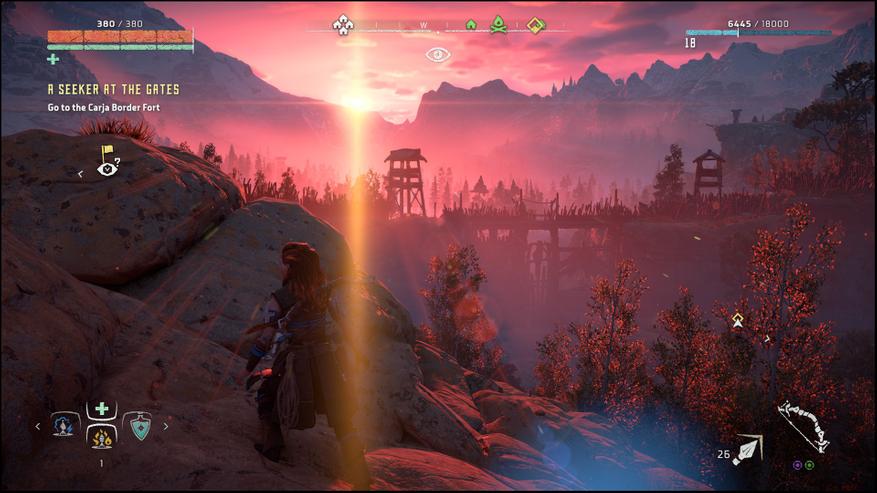 Ну а сам по себе открытый мир почти ничего веселого не генерирует. Есть равномерно рассеянные по карте участки где «пасутся» те или иные роботы, иногда встречаешь шайку бандитов, группку охотников или меридианский патруль. Изредка это всё пересекается в одной точке и друг с другом сражается. Такое себе разнообразие. А воевать с машинами хоть и увлекательно, но не через каждые двести метров. В начале игры это ещё может пригодиться, чтобы набрать ресурсов, но потом уже просто телепортируешься от костра к костру, что, конечно, бьёт по ощущениям от путешествий.