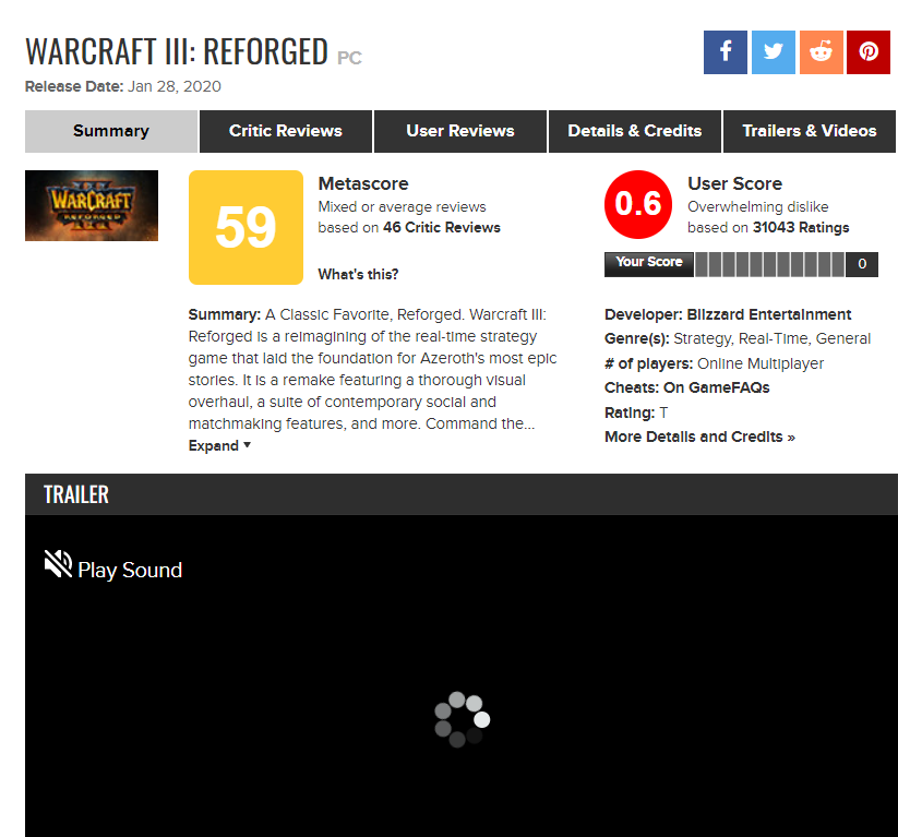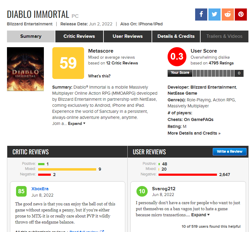 И они не допустили, выпустив ряд проектов без каких либо заметных проблем. Но потом случился Warcraft 3 Reforged. Получивший рекордно низкий рейтинг от пользователей на мете со множеством гневных комментариев. Правда, в данном случае гнев был вызван самой игрой, а не отсутствием возможности в неё поиграть. Хотя бы с этим Blizzard не облажались. Следом за Warcraft 3 Reforged вышли Diablo 2 Resurrected и Diablo Immortal. В случае с последним всё понятно. Магазин вместо игры, ужасная монетизация и прочее. И как следствие, ещё один антирекорд на мете. Но что касается Diablo 2 Resurrected, то тут снова те же грабли, что и в Diablo 3. Переполненные сервера и невозможность поиграть на старте. Иронично, что старая проблема снова возникла во франшизе Diablo. При этом оправдания то же были старыми «Никто не ожидал такого количества игроков». Конечно, в итоге снова всё исправили, но осадок остался.