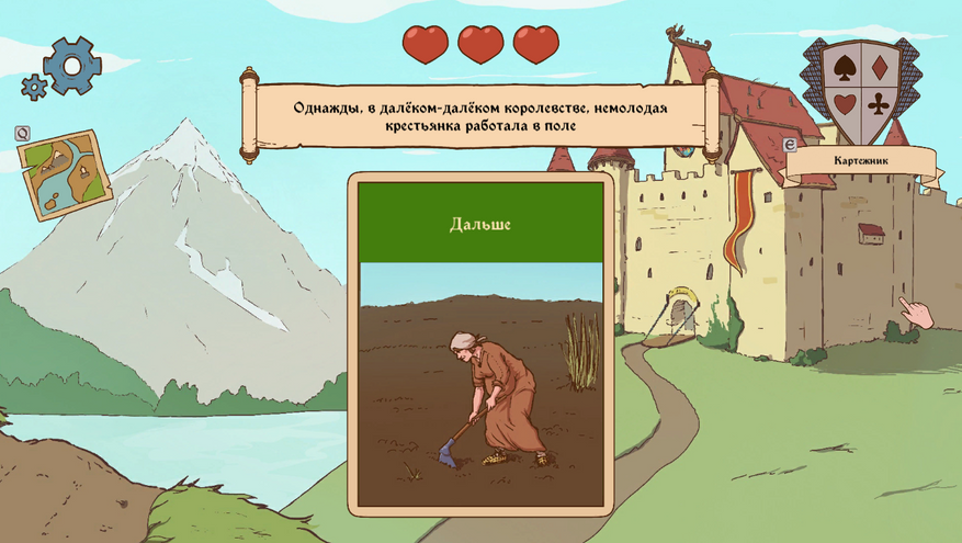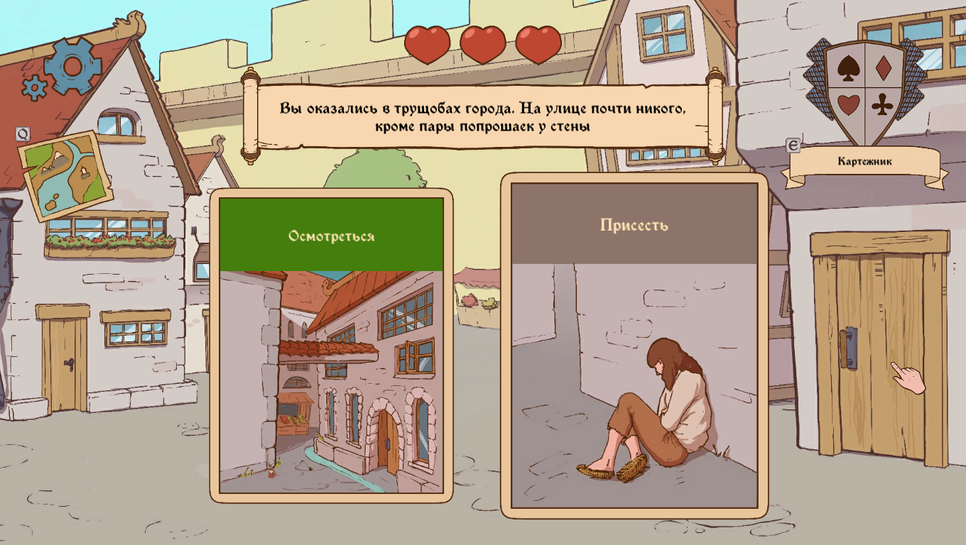 Продемонстрирую игровой процесс на примере. На фоне картинки, изображающей трактирное помещение, выводится текст: «Вы зашли в трактир и поели на славу, теперь хозяин ждёт от Вас уплаты за обед. Денег у Вас нет.» После этого перед Вами предстают две карточки с возможными действиями: «Сбежать» или же «Напроситься к хозяину на работу заместо уплаты». Вы выбираете одну из карточек, и Вам говорят, к чему в итоге то или иное решение привело. Далее следует аналогичный процесс на протяжении всей игры.