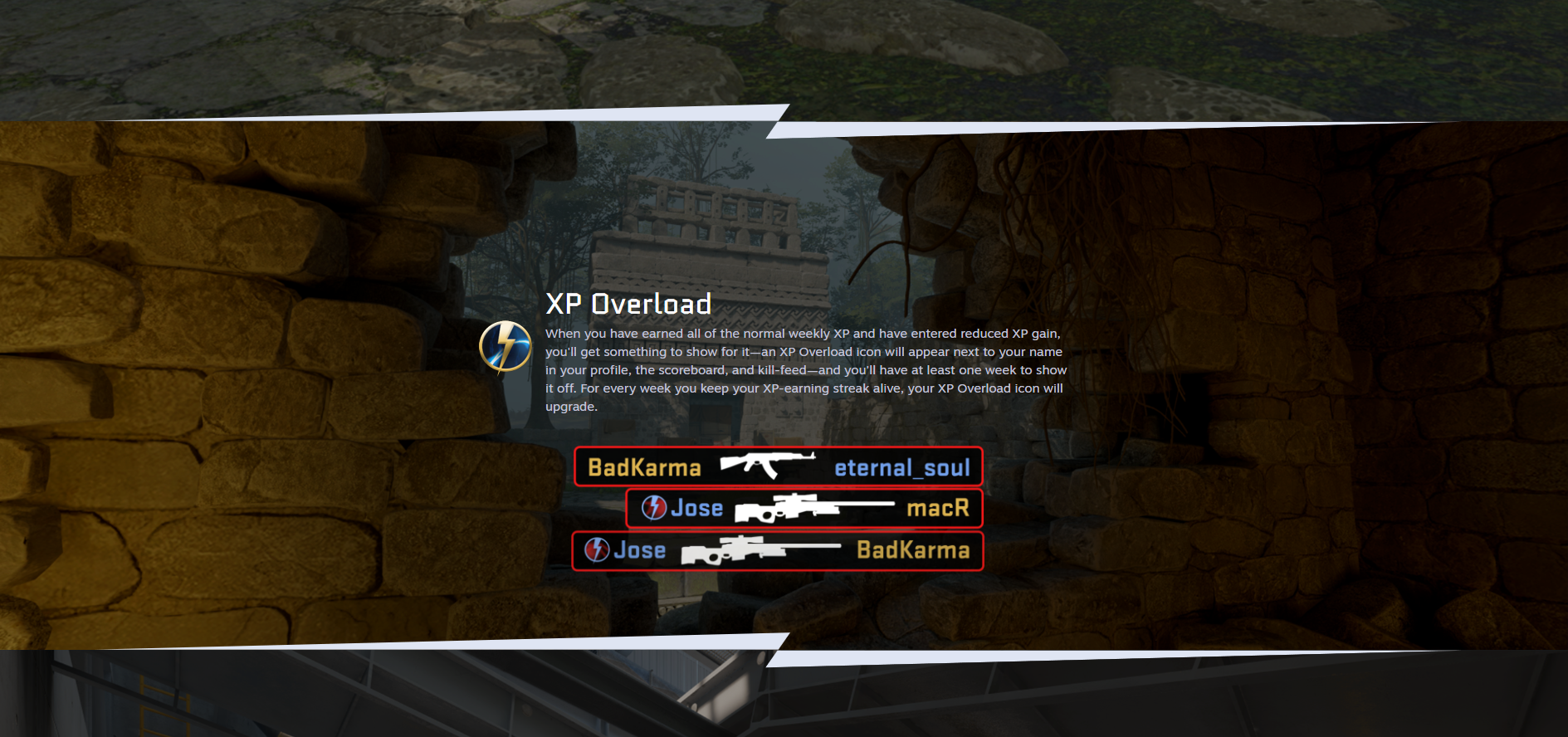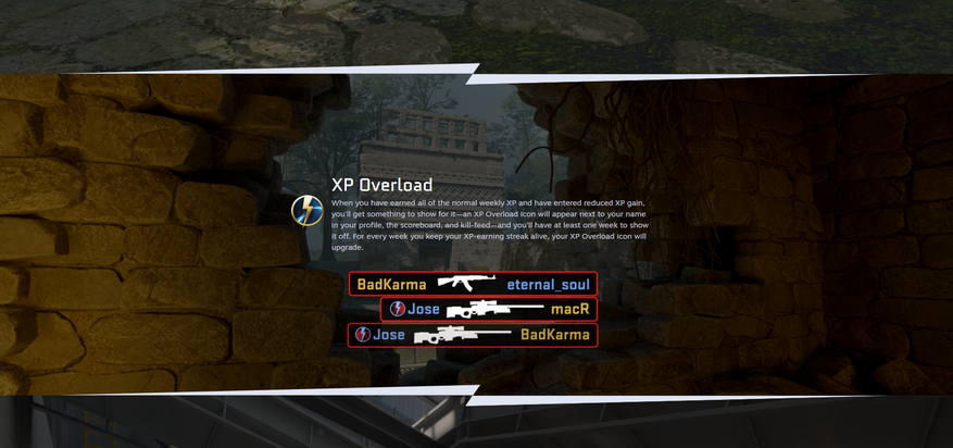 Как всем уже известно, теперь в игре можно выбивать дроп один раз в неделю, когда повышается уровень. Сброс счетчика для дропа происходит каждую среду, после чего дается увеличитель опыта на определенное количество игр. Теперь же, когда вы успеваете потратить весь этот дополнительный опыт за неделю и перейти к пониженной прибавке опыта, то возле вашего ника будет висеть иконка XP Overload, которая видна всем при отображении ваших убийств/смертей в углу экрана. Если вам удается сохранять этот индикатор беспрерывно на протяжении недель, то он улучшается. Скорее это просто показатель того, насколько много времени вы проводите в игре и не более.