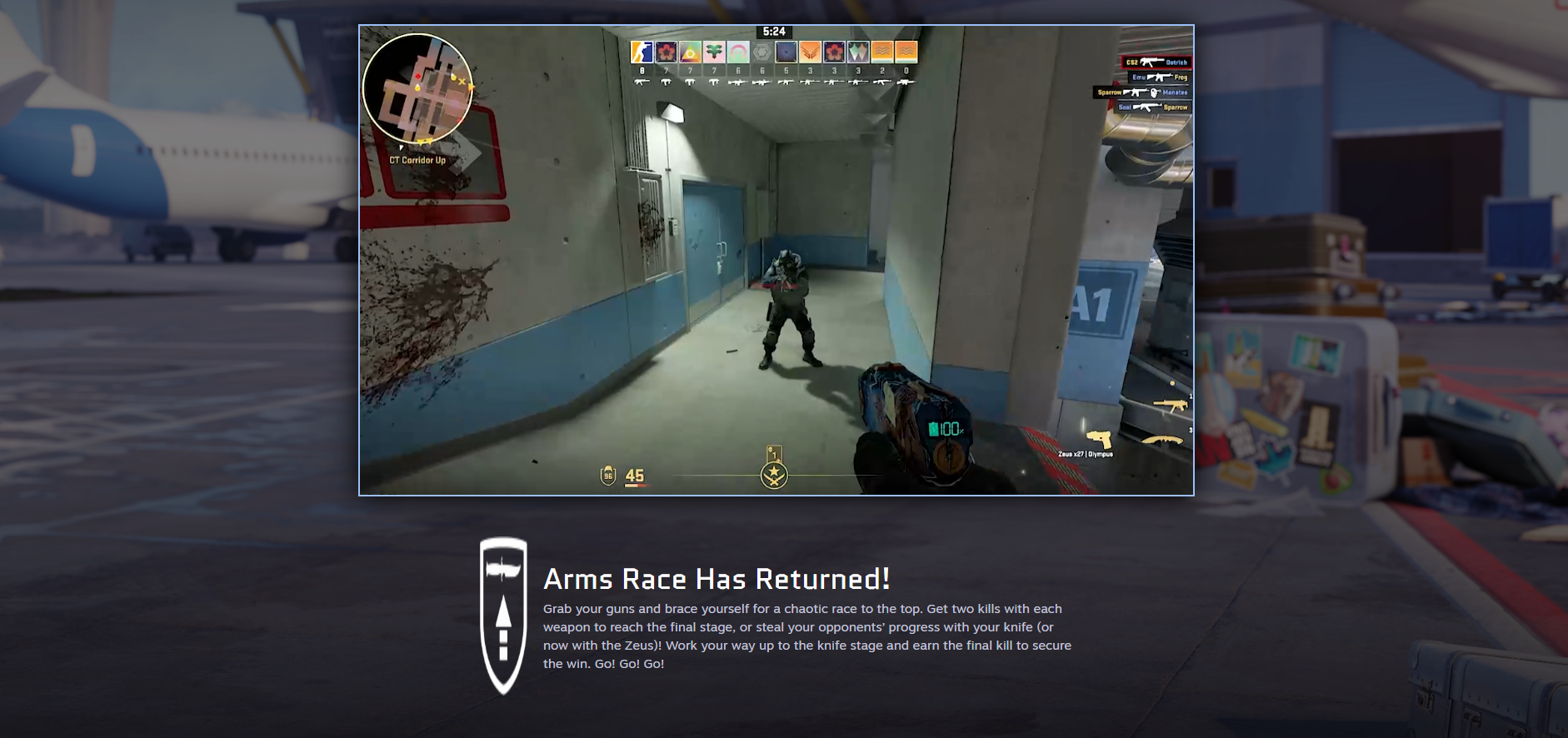 На релизе CS2 далеко не все режимы сразу перекочевали из предыдущей версии игры, я отказываюсь считать CS2 новой частью серии. Одним из таких режимов была «Гонка вооружений», где суть заключалась в перестрелках на маленьких аренах против всех. Однако оружие выдавалось в строгой очередности и за убийства с этого самого оружия. Последнее убийство предстояло совершить с помощью золотого ножа, что обеспечивало победу в матче. Насколько я могу судить, в режим перенесли все старые карты и просто адаптировали ее под новый движок.