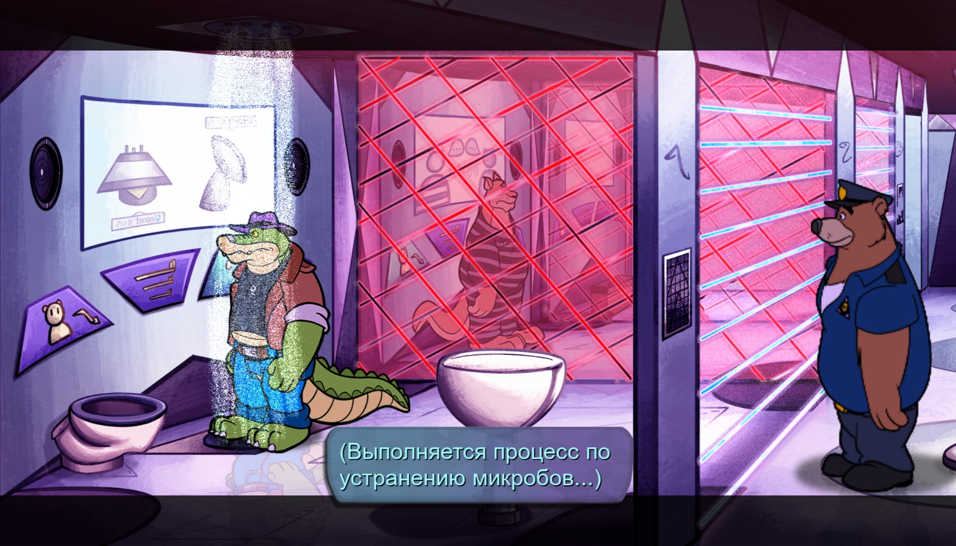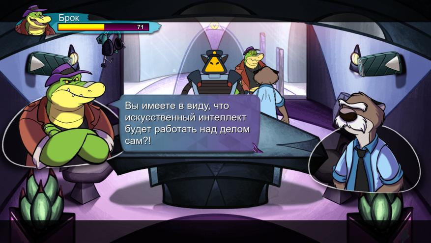 Визуал BROK the InvestiGator держится на приятном, простеньком, рисованном арте. Интересных графических эффектов не обнаружено, хотя отражения присутствуют, что приятно. Стилизована игра под мультфильмы восьмидесятых — девяностых годов типа сериалов «Утиные истории» и «Чудеса на виражах». Палитра подобрана хорошо, деталей окружения много, антураж прописан сносно. Анимации незамысловатые, но множественные и глаз не напрягают. Движения и удары в бою считываются хорошо. Рисованные картинки с моськами персонажей в диалогах нормально передают эмоции и чувства. Игра шла без лагов, багов и проблем на Xiaomi Redmi Note 10S с восьмиядерным процессором MediaTek Helio G95, графическим процессором Mali-G76 MC4 и оперативной памятью 6 ГБ. Настроек изображения под своё соотношение экрана я не нашёл — это минус.