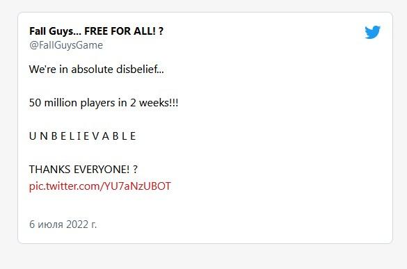 Недавно выяснилось, что не более чем за двое суток после того, как произошел переход на условно-бесплатную модель распространения в Fall Guys: Ultimate Knockout в игру успели сыграть более двадцати миллионов пользователей. На данный момент прошло уже две недели, и число игроков повысилось до 50 000 000.