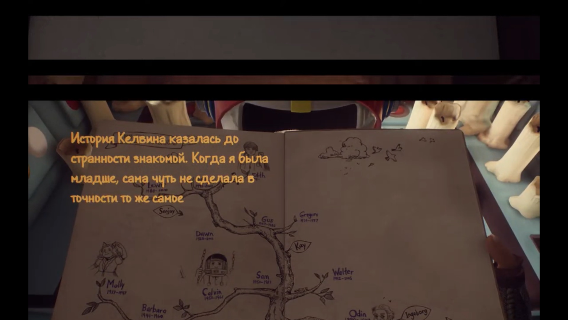 Историй много и каждая обставлена по-своему. Есть длинные, а есть те, что проходятся буквально за минуту. Мы будем кошкой, которая лазит по деревьям и охотится за птичкой. Перевоплотимся в короля вымышленных земель и будем путешествовать в поисках принцессы. Будем бояться монстра из под кровати и тд. Не хочется раскрывать вам все сюжеты. Гораздо приятнее знакомиться с ними самому. Тем более что история в целом довольно эмоциональна и если вы внимательно следите за комментариями Эдит, то уже к середине игры семейство Финчей становится вам как родное. Вы словно жили с ними в этом доме в лучшие времена. Слушали как спорят бабушка Эди с матерью, заказывали китайскую еду из единственного ресторанчика, который согласился доставить заказ в такую глушь или играли в приставку с братом Льюисом. Финчи стали своими. Поэтому каждая новая смерть воспринимается все тяжелее.