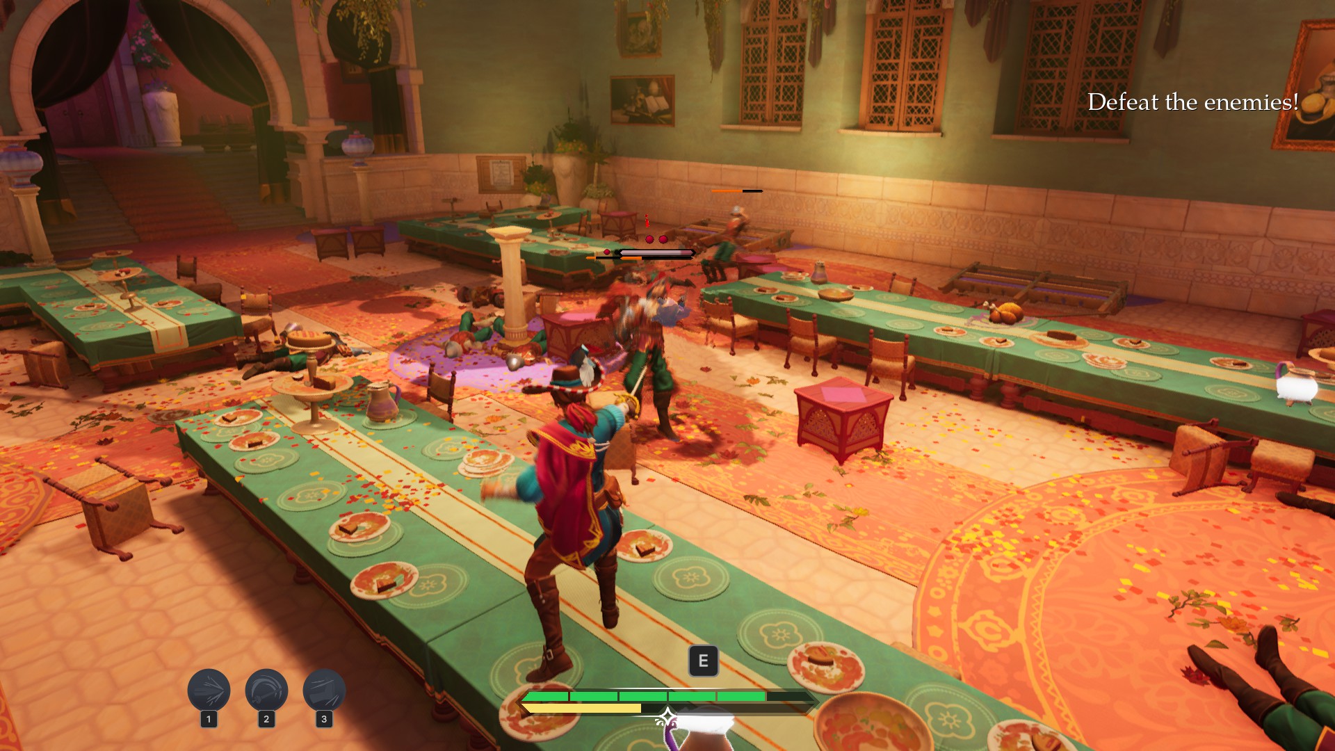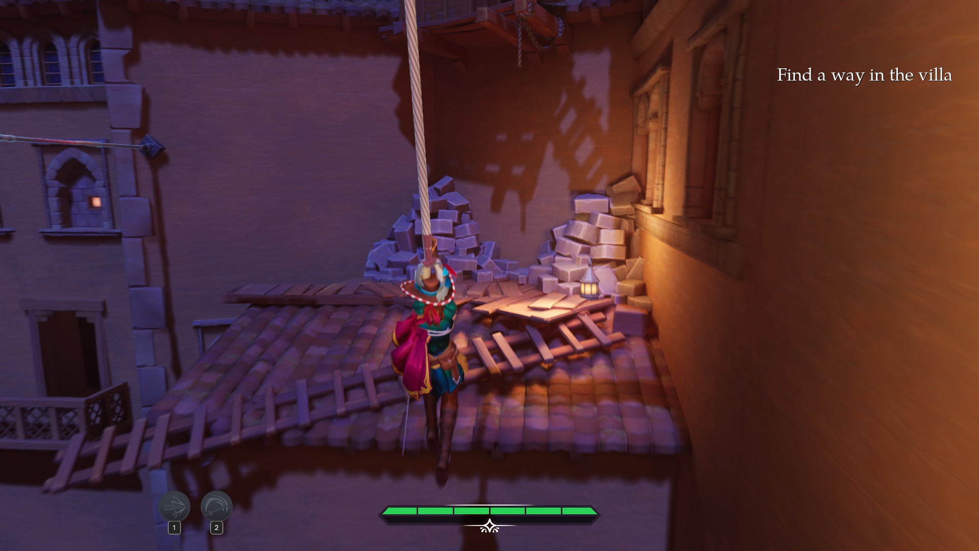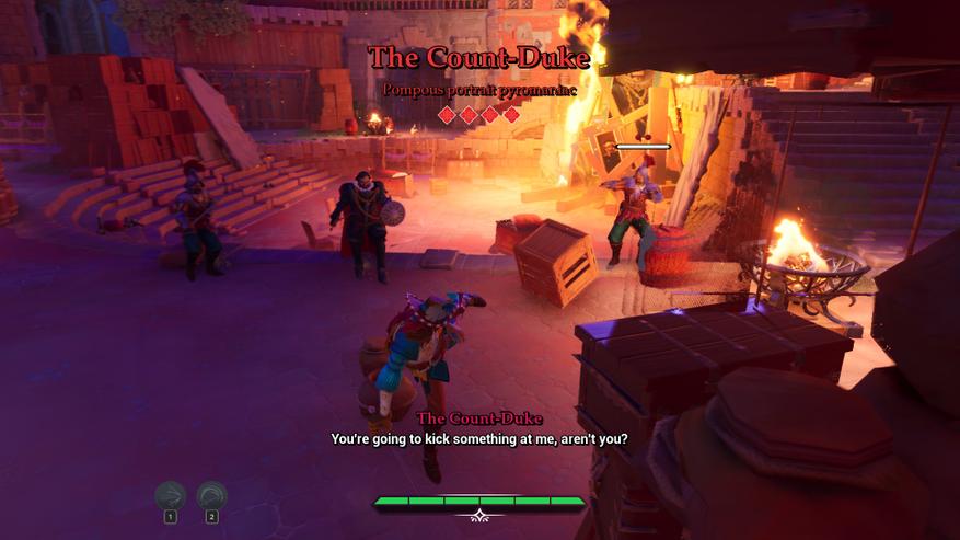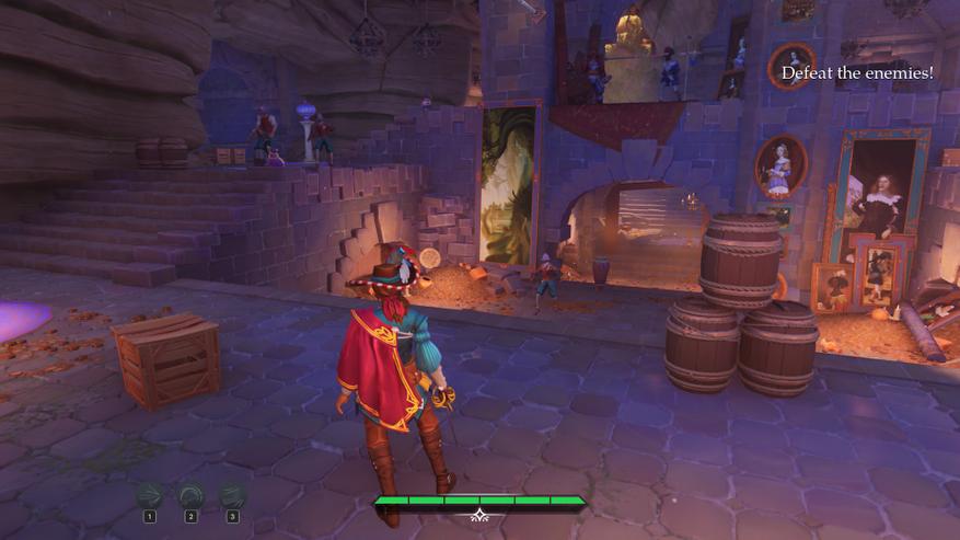 Главным и любимым элементом игры является взаимодействие с окружением. Стоит понимать, что мы владеем фехтовальным оружием, которое подразумевает дуэли 1 на 1, а не месиво против толпы врагов. Поэтому игра сама мотивирует бегать по арене и искать дополнительные возможности для маневров. Таким образом, можно толкать на врагов бочки, кидаться в них вазами и бомбами, стрелять из пушки и сталкивать с обрывов. Подобное взаимодействие с окружением позволит либо полностью нейтрализовать противника, либо сбить ему стамину или полностью сломать защиту.
