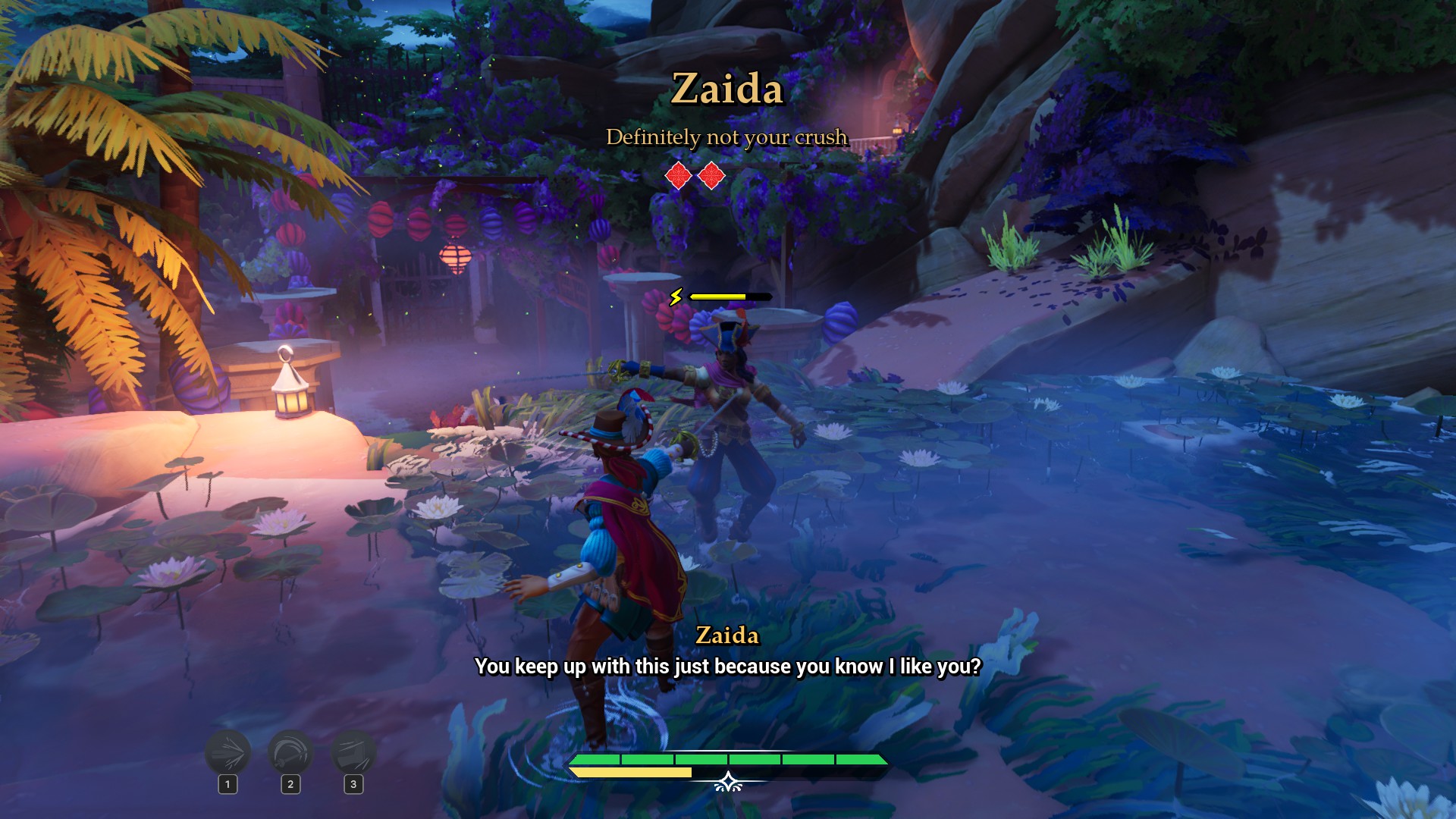 Фехтование в основном состоит из парирований и уклонений, здесь нет комбинаций комбо. Если уклонение гарантированно позволит избежать удара, то парировать можно не любой выпад. Отразить можно атаки только подсвеченные белым или синеватым цветом, здесь щадящие тайминги, поэтому можно быстро наловчиться. От атак помеченных красным крестом можно только уклониться. Если делать данные маневры в последний момент, это позволит нанести критический удар по врагу. Также со временем открываются три способности, для активации которых нужно заполнить шкалу одолевая врагов. Они позволяют восстановить одну ячейку здоровья и нанести значительный урон или же сбить с ног.