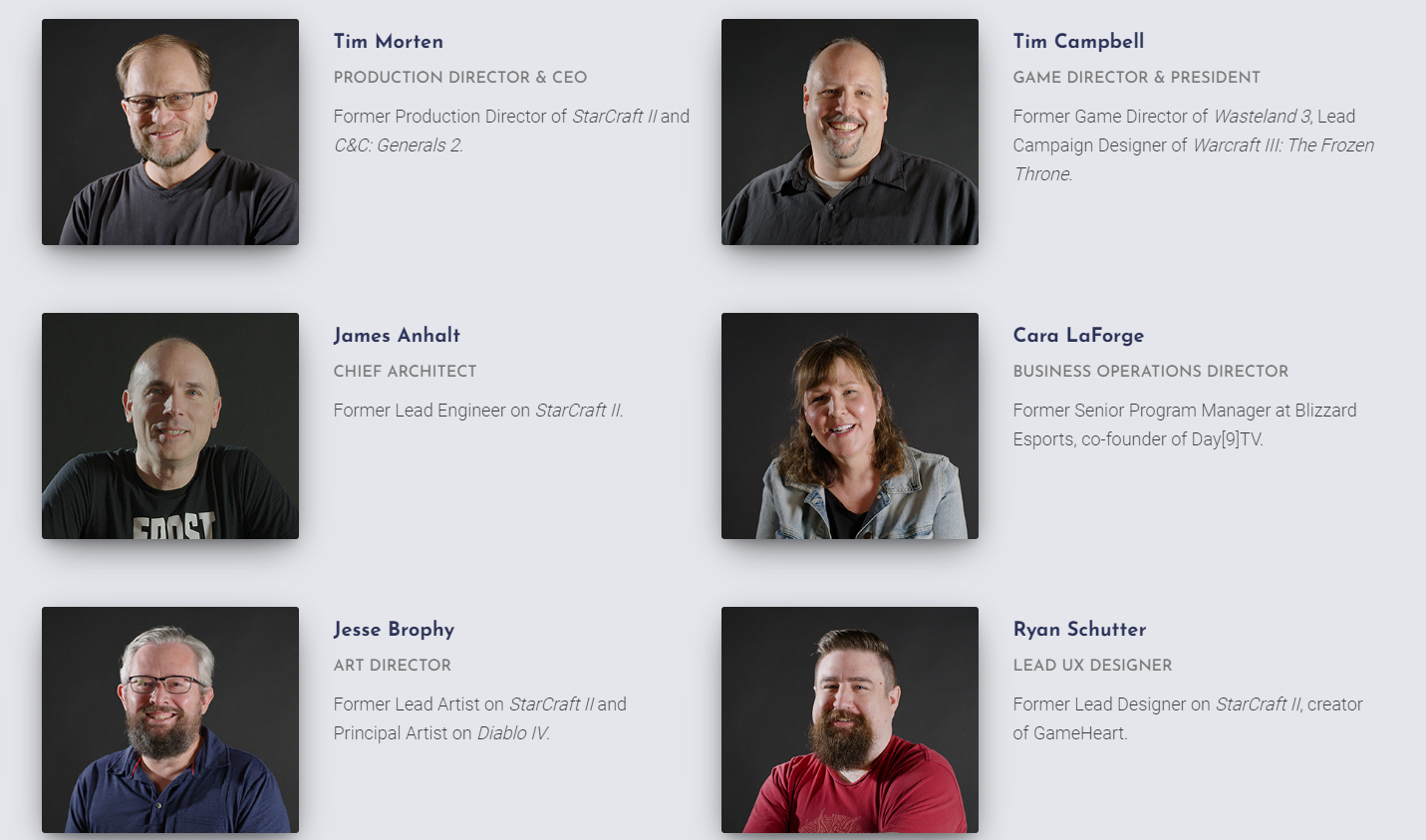 В их числе Тим Мортен — бывший директор по производству Starcraft II и C&C: Generals 2, ныне директор по производству и генеральный директор. Тим Кэмпбелл — бывший игровой директор Wasteland 3, ведущий дизайнер игры Warcraft III: The Frozen Throne, ныне игровой директор и президент. Джеймс Анхальт — бывший ведущий инженер Starcraft II, ныне главный архитектор. Джесси Брофи — бывший ведущий художник Starcraft II и главный художник Diablo IV. А также многие другие.