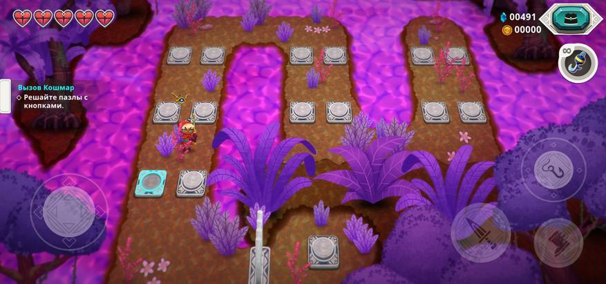 Анимации в игре очень простые и на вид дешёвые. Однако постоянный интерактив и отзывчивость окружения не дают глазу заскучать. Каждая травка и кустик реагируют на прикосновение героини. Большое количество объектов на локации можно срубить ударом. Вокруг постоянно вьется какая — то живность, типа порхающих бабочек. Плавают в водоёмах рыбы, которые являются ресурсом и неотъемлемой частью геймплейных механик. Рядом с протагонистом летает бот — помощник. Сама героиня ведёт себя живо, теребя оружием или ногами. Из-под её сапог выбивается пыль при беге. Анимации чётко выполняют свой геймпейный функционал и не выбиваются из общей упрощённо — мультяшной картинки игры. В разгар жаркого сражения со множеством противников на арене ты понимаешь, что анимации в игре ровно такие, какими и должны быть. В этой части вопрос нет.