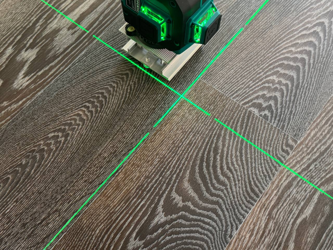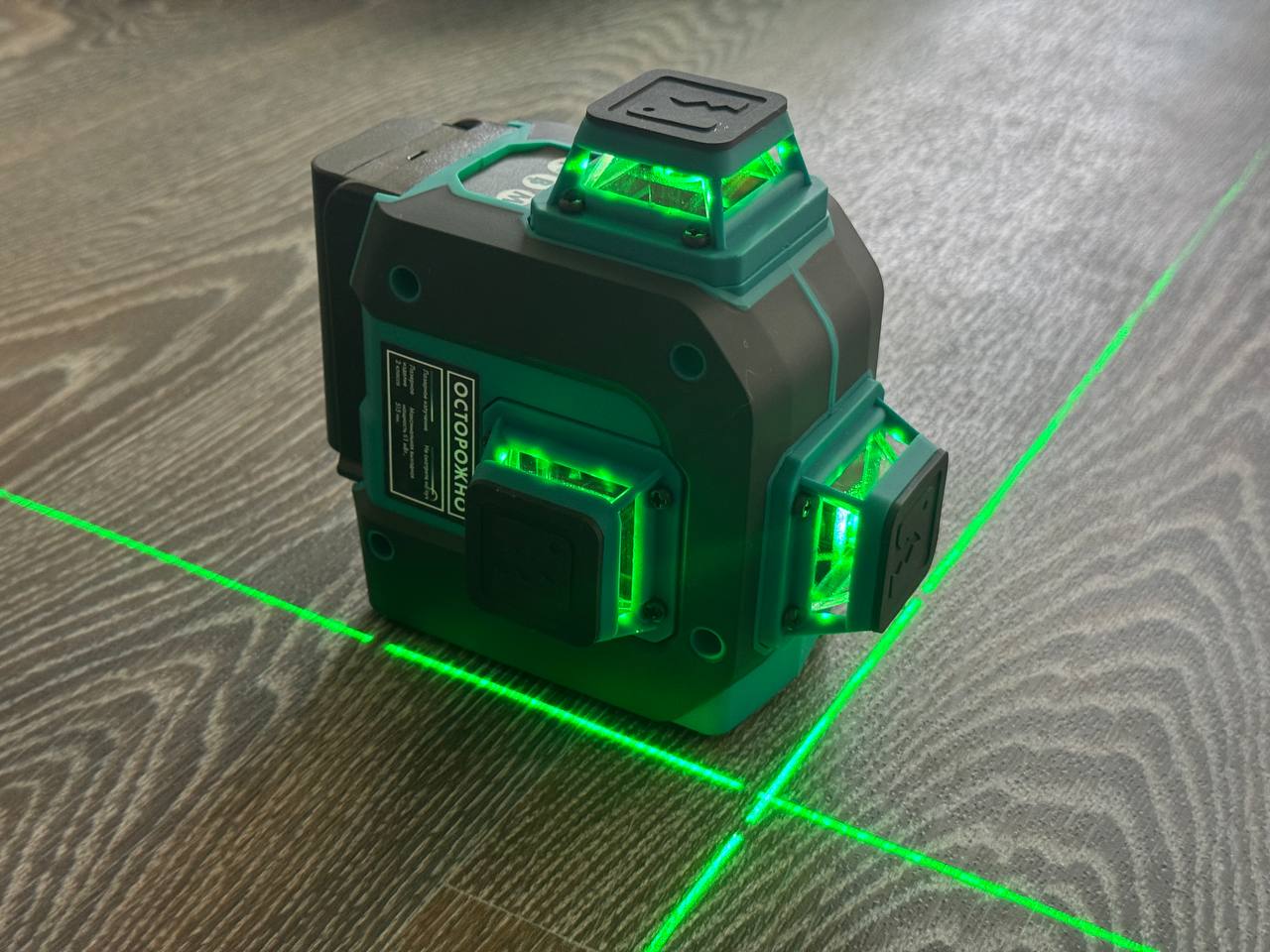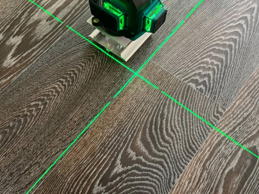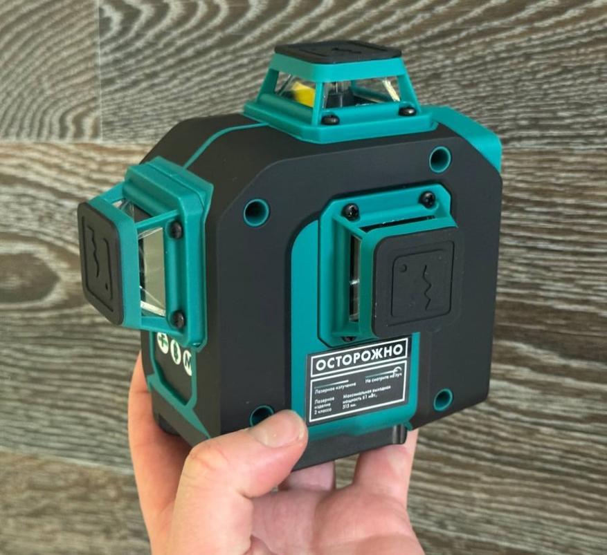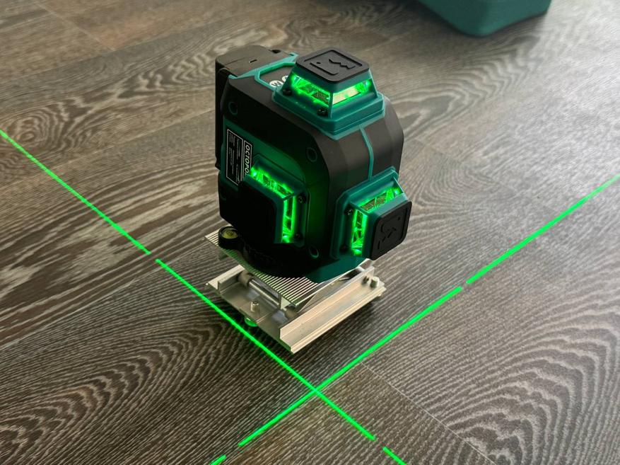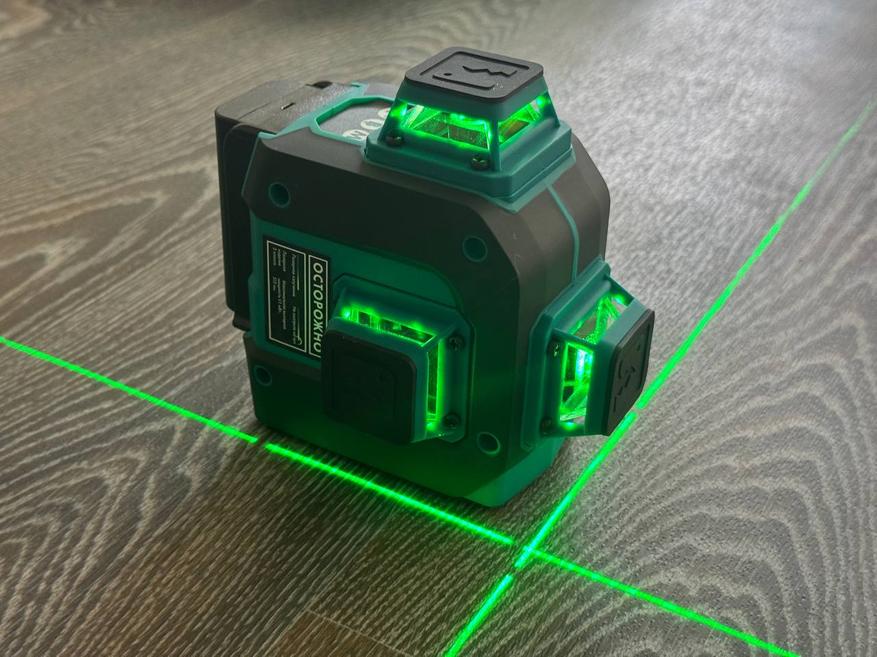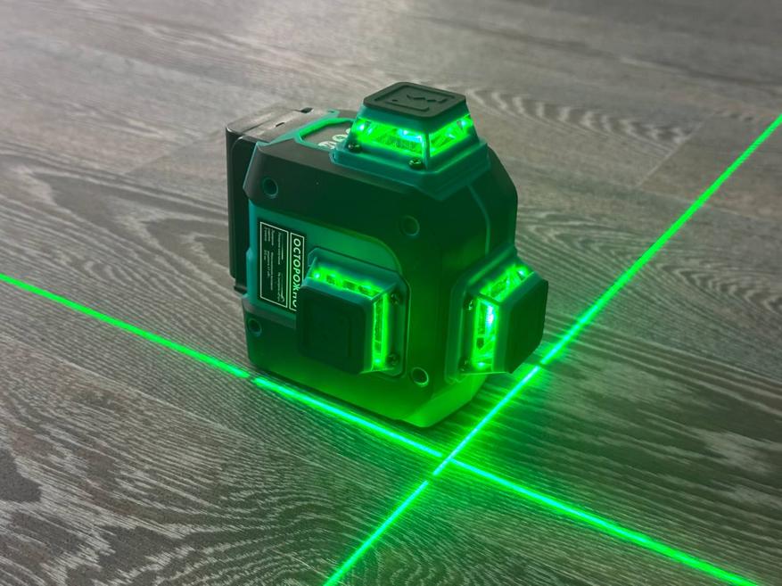 Прибор оснащён 3-мя японскими лазерными излучателями Sharp и проецирует 12 лазерных линий, образующих 6 перекрёстий под углом 90 градусов. Такая конструкция позволяет одновременно проецировать три плоскости, значительно ускоряя процесс разметки. Использование зелёного лазерного луча с длиной волны 515 нм обеспечивает отличную видимость разметки даже при ярком солнечном свете, с эффективной дальностью работы до 30 метров. Даже в полностью освещенной комнате лучи очень хорошо просматриваются.
