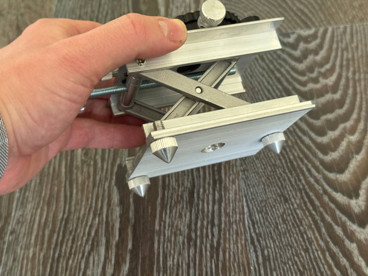 Также профессионалы оценят наличие треноги с микролифтом, позволяющей регулировать высоту положения прибора. Она выполнена из алюминия и выглядит достаточно добротно. Также имеет регулировку вылета и поворота установленного на нее устройства. Внизу конусообразные ножки с регулировкой вылета. Коническая форма позволяет ровно размещать установку на неровные шершавые поверхности типа бетона или грунта. Сверху есть пузырьковый уровень.