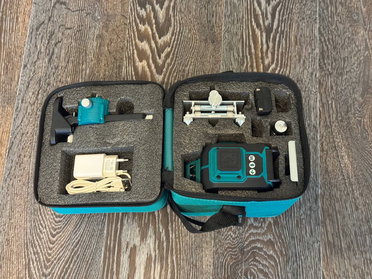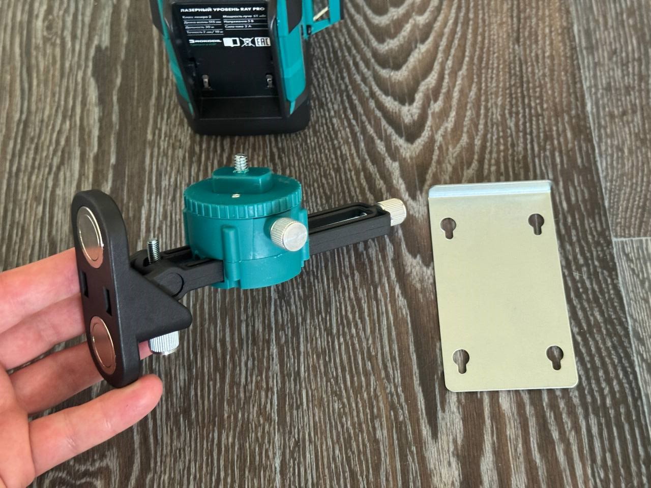 В комплект входит сам лазерный уровень, инструкция, зарядка с кабелем USB-USB-C, пульт дистанционного управления, магнитное крепление на отвесные поверхности с металлической пластиной, тренога с микролифтом и еще одно крепление-кредл с магнитом.