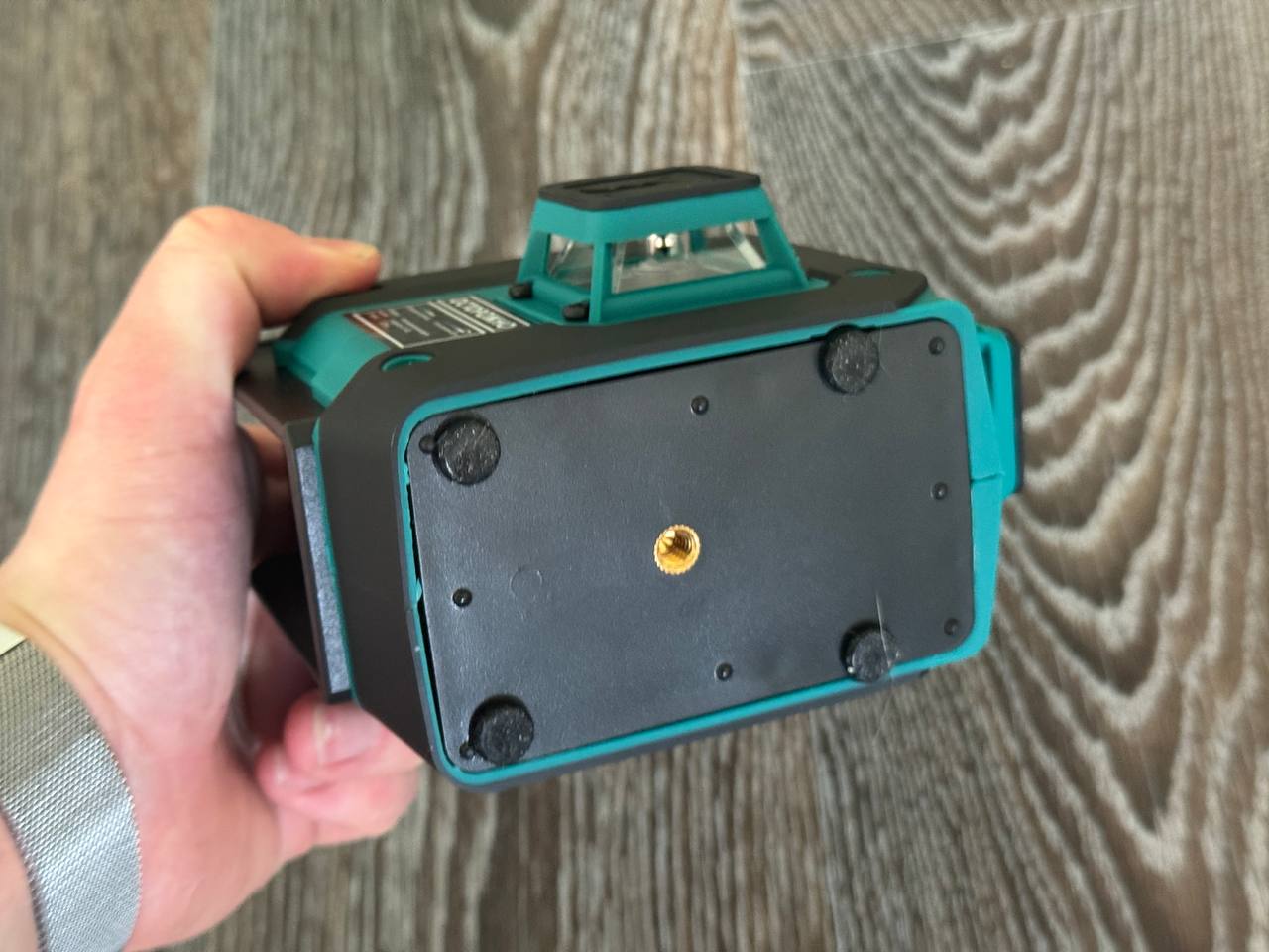 По контуру уровень обрамлен черным прорезиненным пластиком, который не только придают устройству эргономичный внешний вид, но и выполняют защитную функцию, эффективно амортизируя удары при случайных падениях. С левого бока находится ползунок включения (он же тумблер разблокировки маятника) и логотип бренда. Ширина лазерного уровня с учетом установленного аккумулятора составляет 14 см. Высота — 13,3, а глубина — 8,3 сантиметра соответственно.