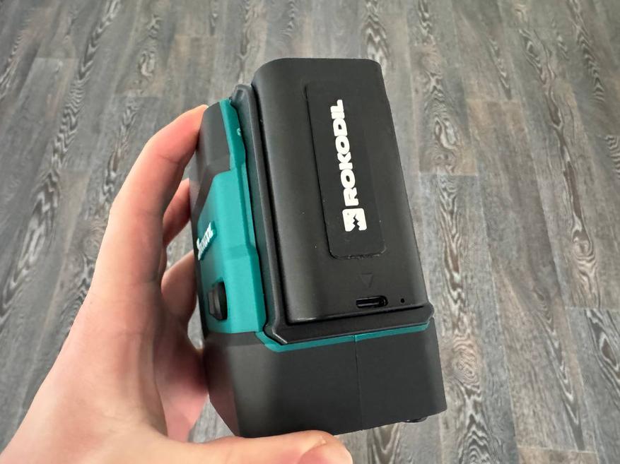 Отдельно идёт достаточно емкий аккумулятор на 4800 мАч с современным разъёмом USB Type-C. Такой источник питания обеспечивает работу устройства до 10 часов при минимальной яркости луча. А при максимальной яркости автономность устройства составит до 5 часов. На задней части аккумулятора приклеена резиновая пластина, создающая дополнительный демпфер в случае падения.