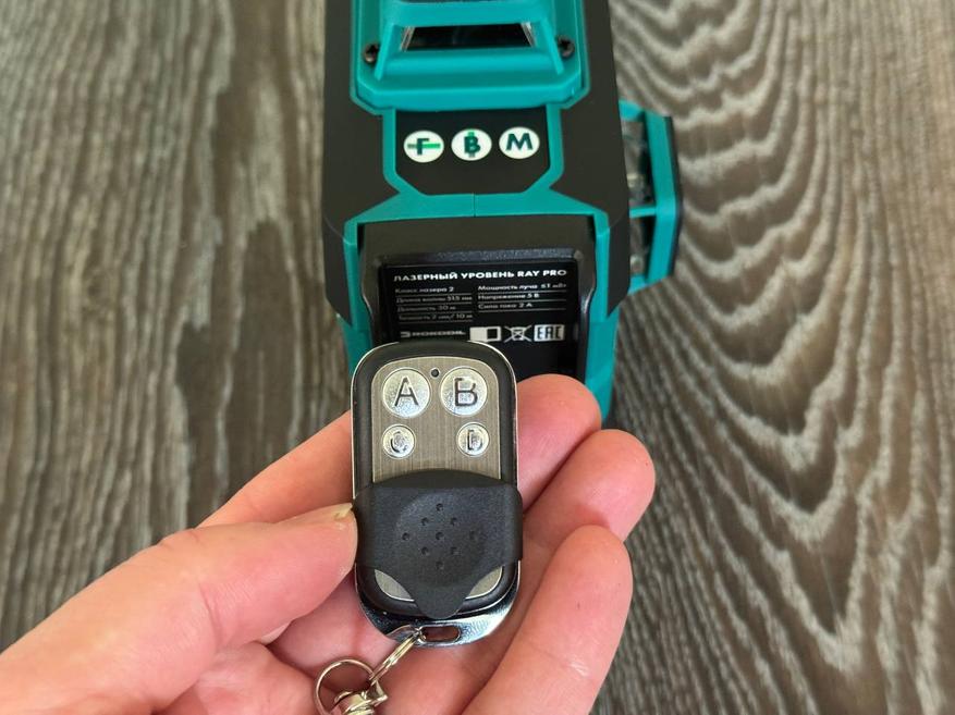 Еще раз хочу обратить внимание на входящий в комплект пульт. Он компактный, имеет карабин и позволяет активировать и деактивировать (кнопка А) лазерные линии на расстоянии, что значительно повышает удобство работы, особенно при частой смене местоположения оператора или при работе в труднодоступных местах. Такая система управления существенно ускоряет рабочий процесс и снижает физическую нагрузку на пользователя.