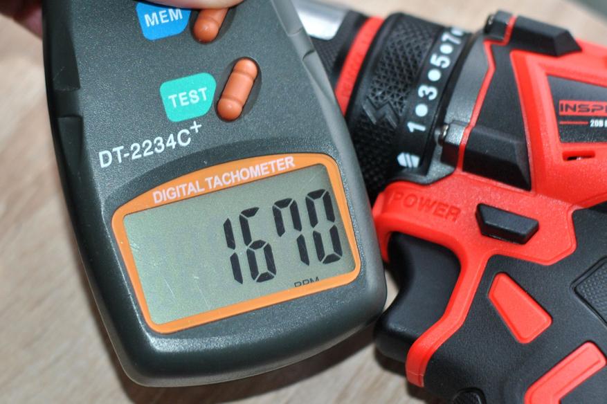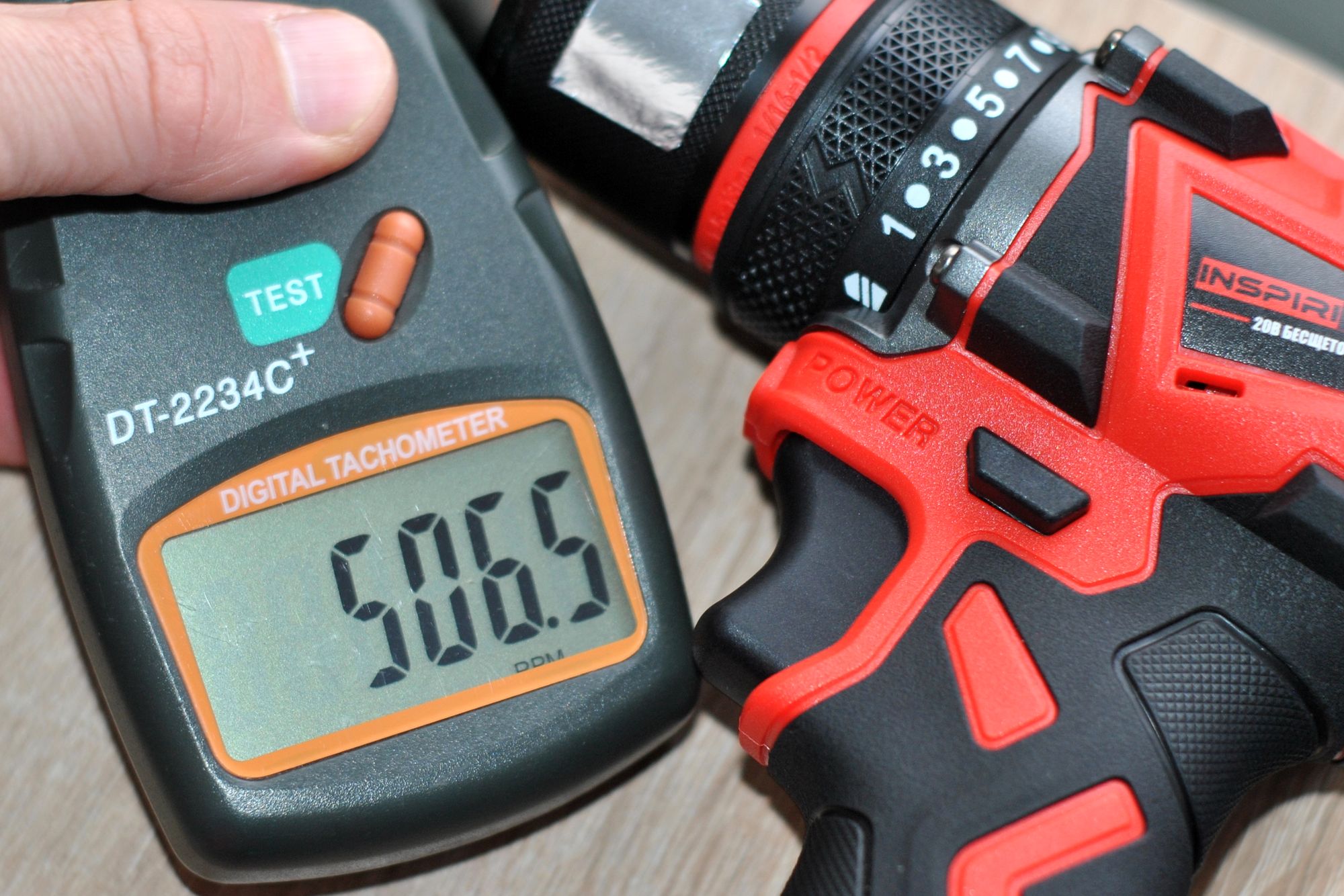 Шуруповерт на холостых оборотах кажется довольно резвым, проверим скорости вращения бесконтактным тахометром (2 положения редуктора):