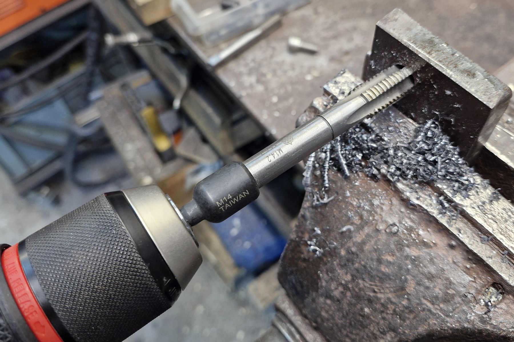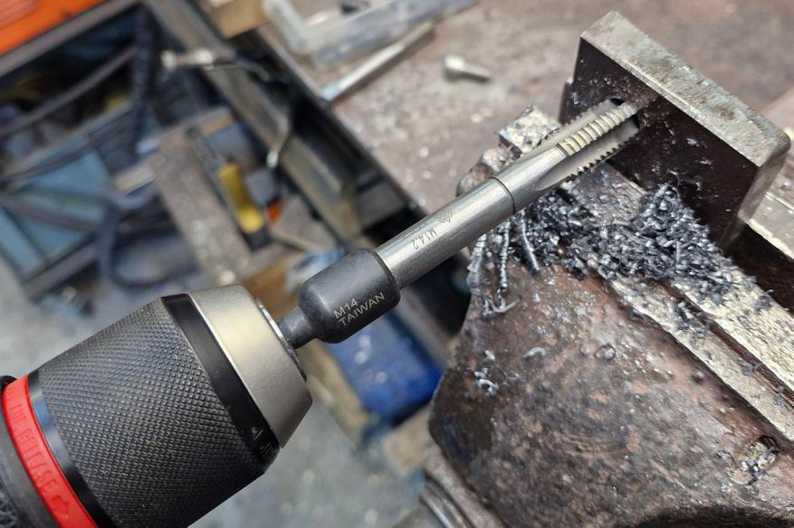 М12 нарезается без проблем, а с метчиком М14 уже не хватает крутящего момента на низких оборотах (либо срабатывает защита по току АКБ).