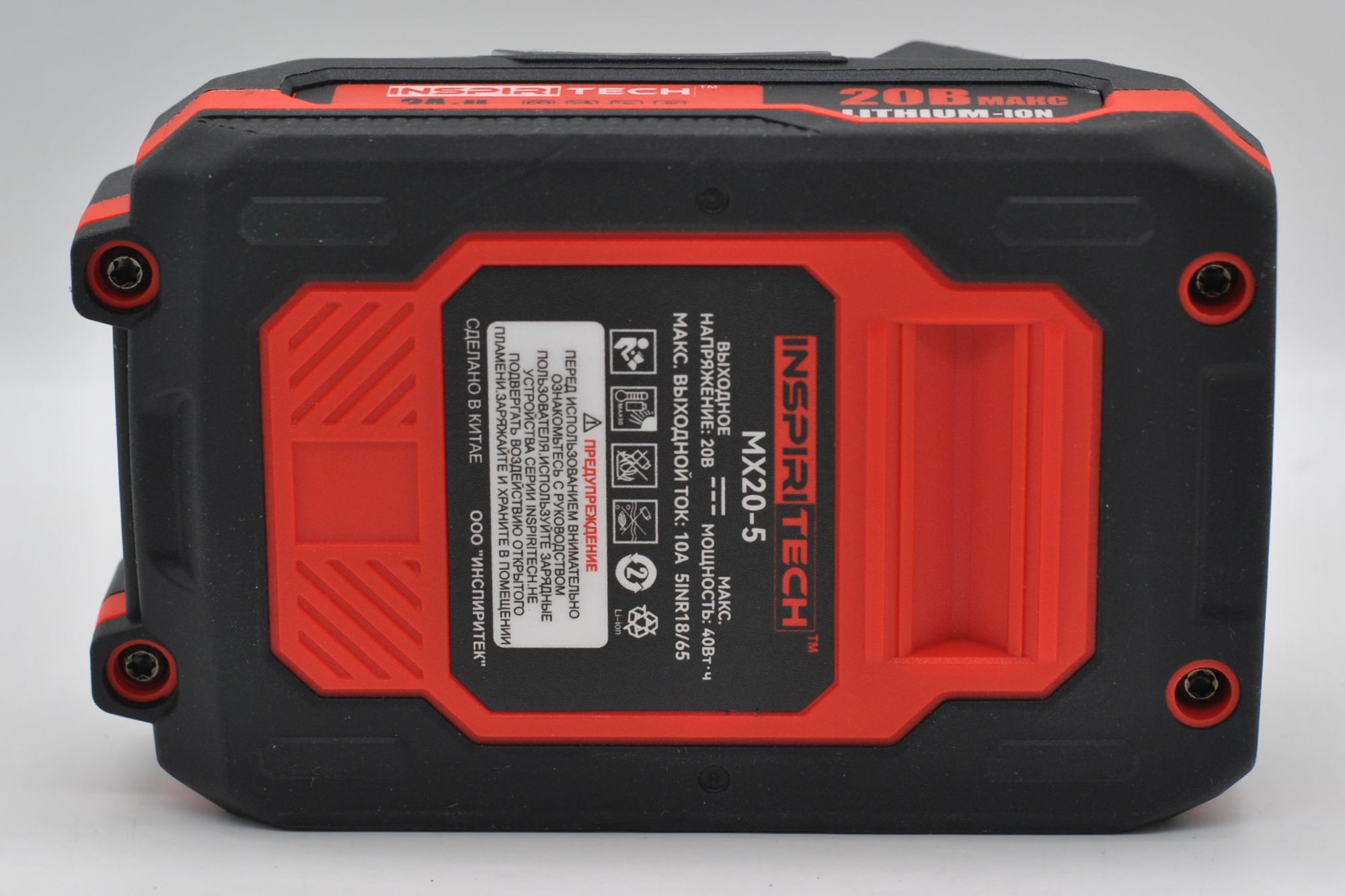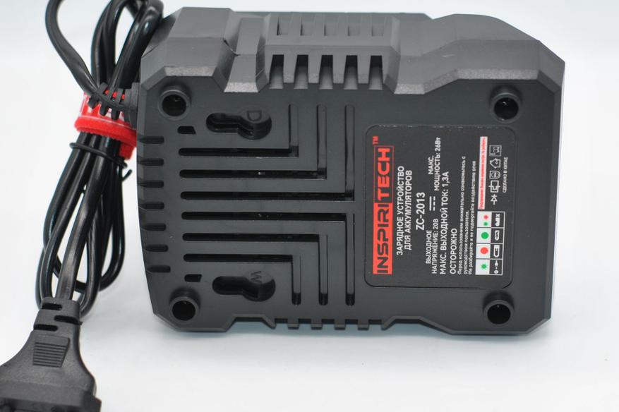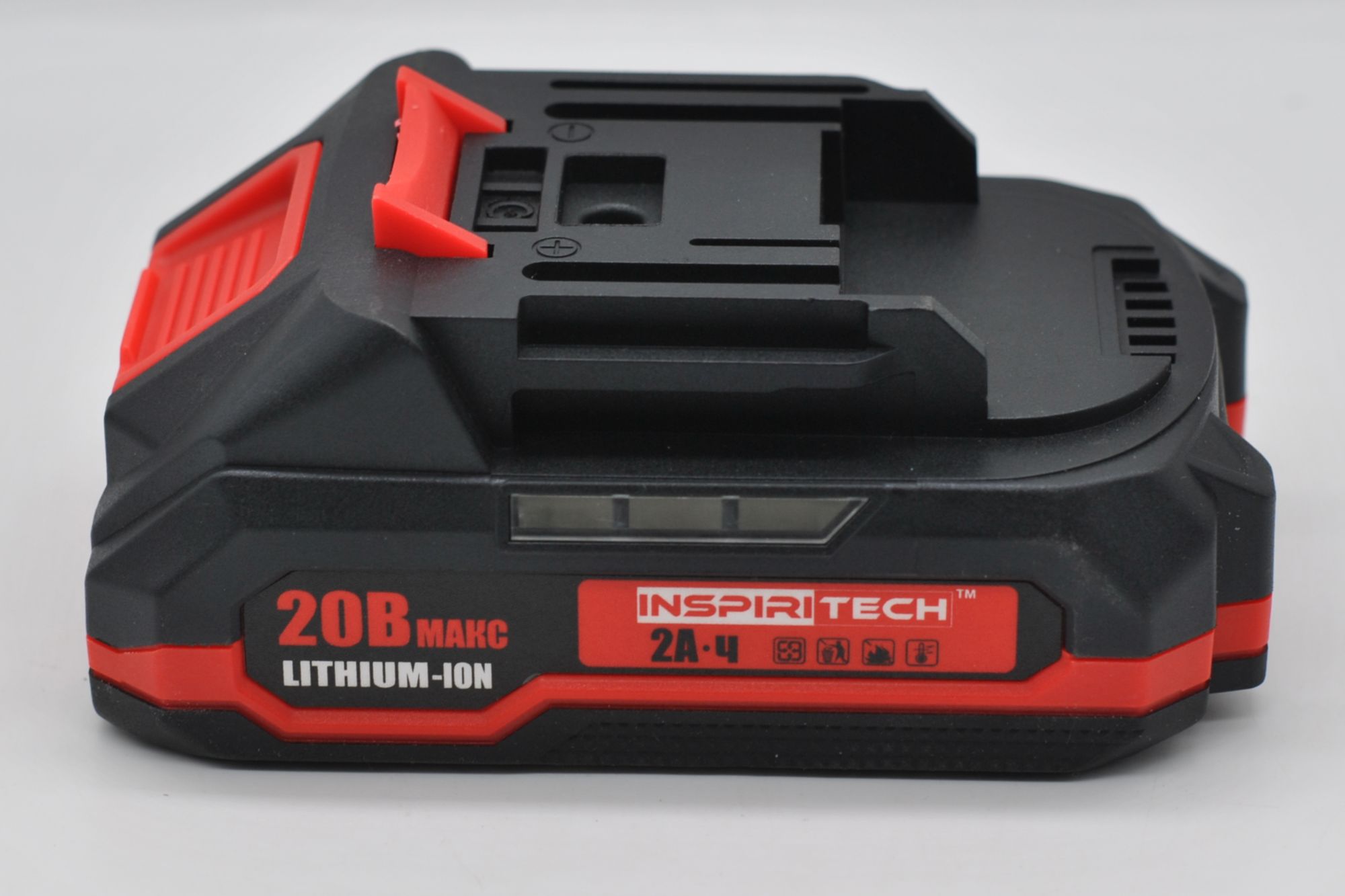 У бренда INSPIRITECH литиевые батареи слайдерной посадки в корпус инструмента. Тут 2 шт. в комплекте по 2000 мАч. Размер 12х7,5х5 см. Масса 409 г. В нижней части прорезиненный пластик (софт-тач), чтобы не скользил. Дополнительный зарядный порт (5,5х2,1 мм) в верхней части, индикаторы заряда (3 светодиода) с каждого бока.