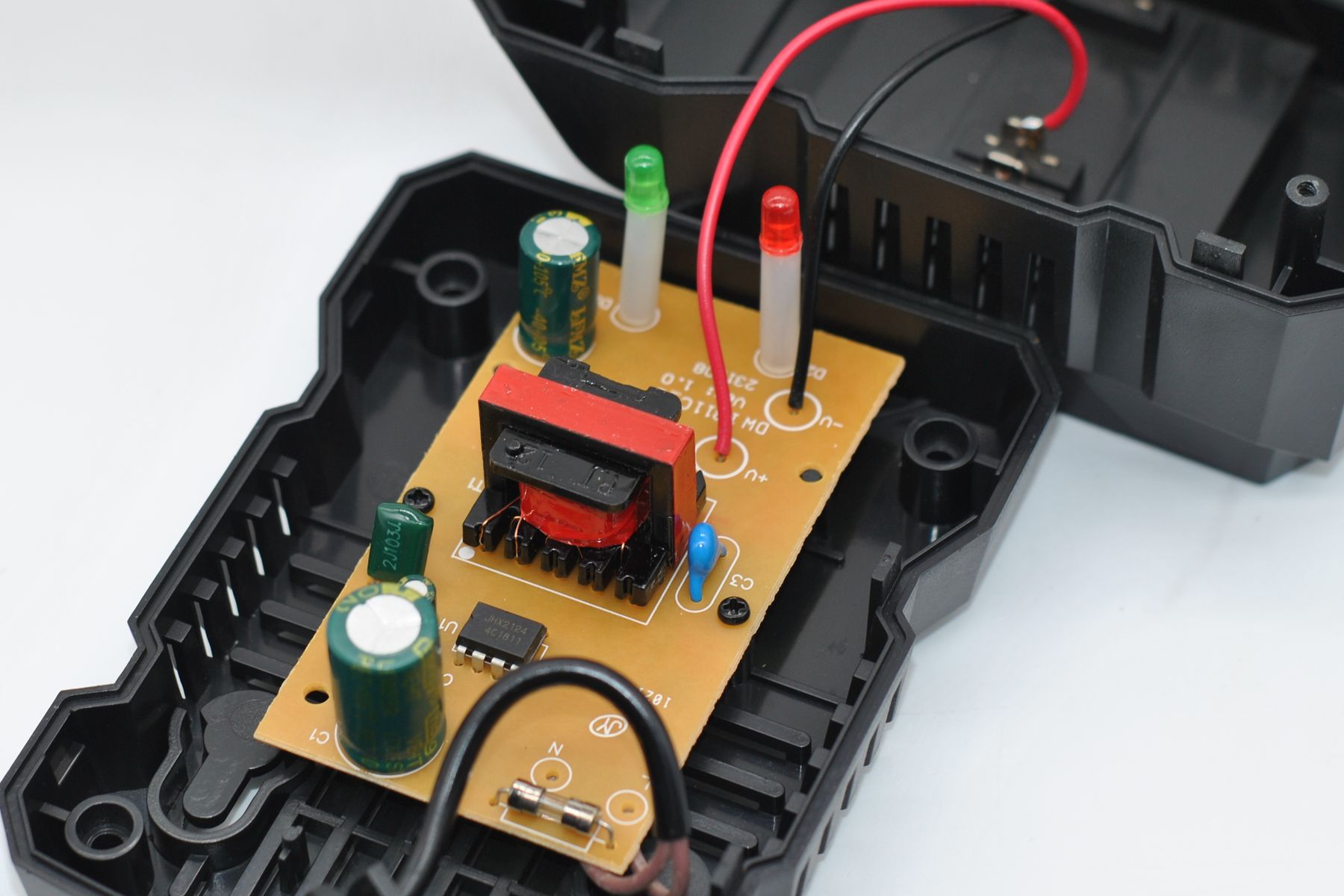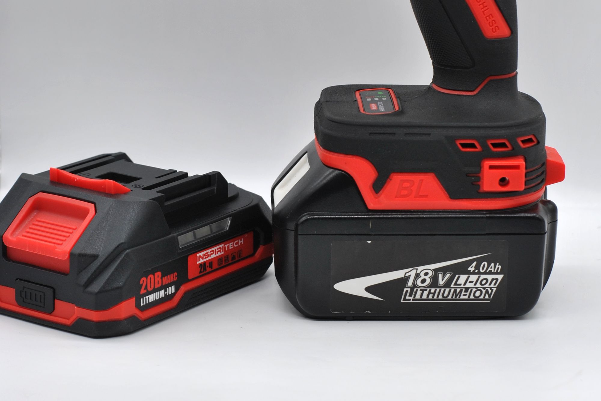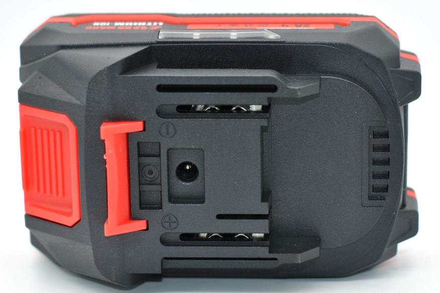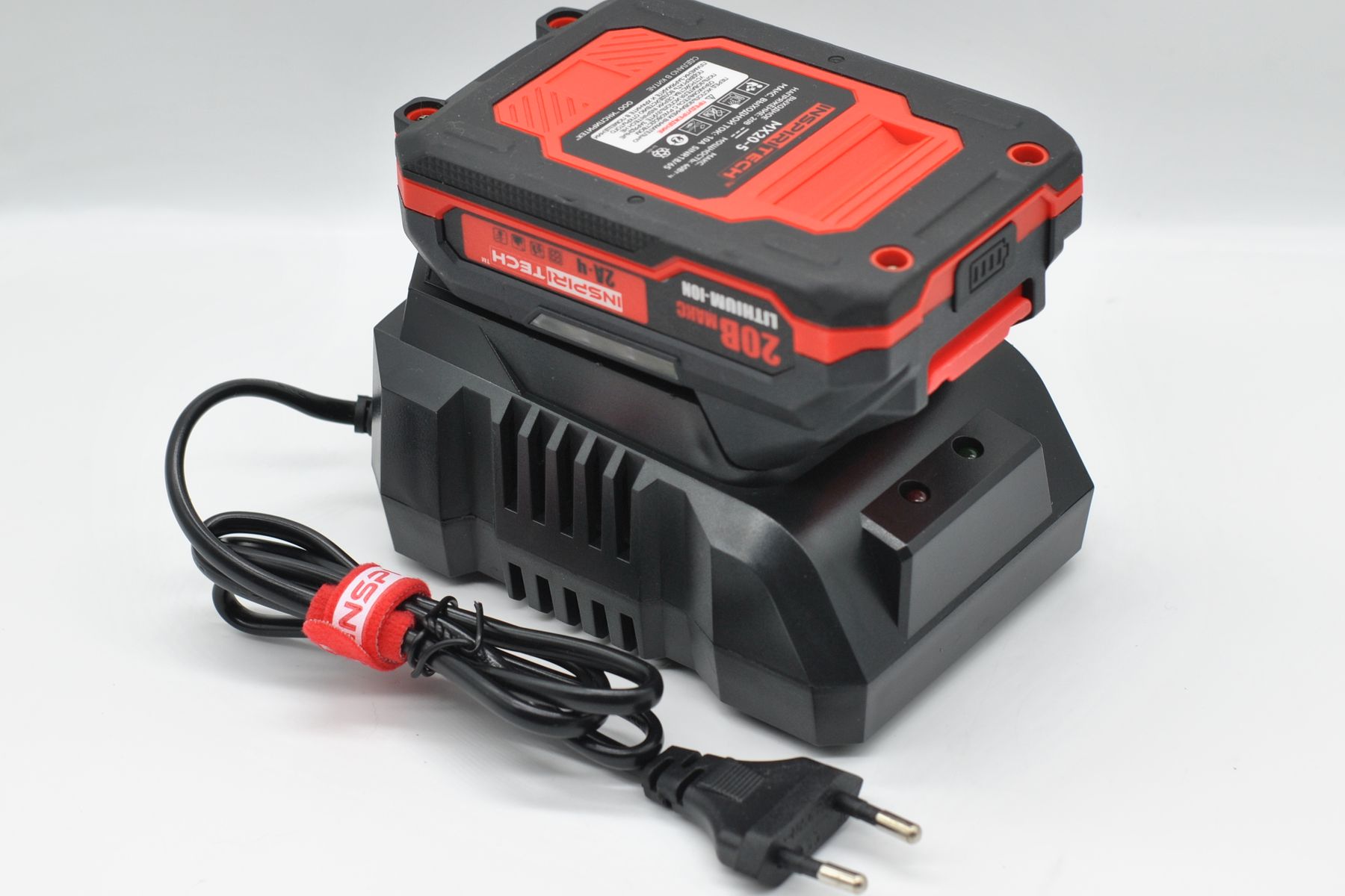 У бренда INSPIRITECH литиевые батареи слайдерной посадки в корпус инструмента. Тут 2 шт. в комплекте по 2000 мАч. Размер 12х7,5х5 см. Масса 409 г. В нижней части прорезиненный пластик (софт-тач), чтобы не скользил. Дополнительный зарядный порт (5,5х2,1 мм) в верхней части, индикаторы заряда (3 светодиода) с каждого бока.