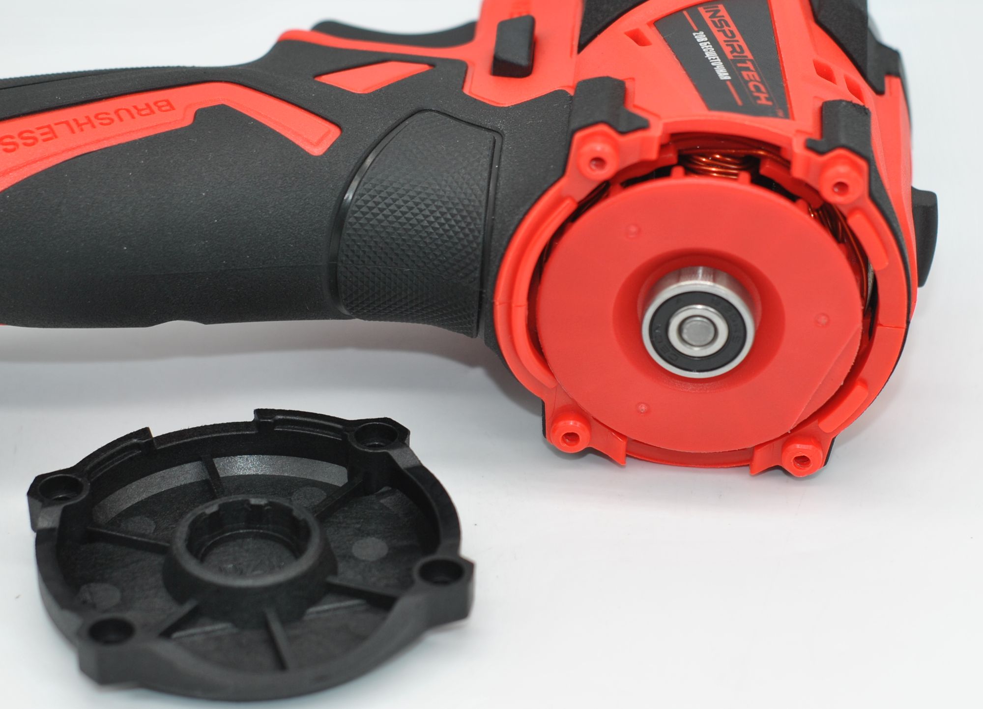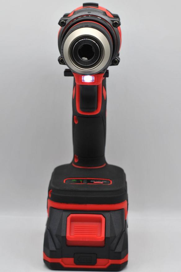 Безударный шуруповерт INSPIRITECH WD7420 имеет традиционную пистолетную компоновку, устойчиво стоит вертикально с установленным аккумулятором. Линия оси патрона почти вертикальна. Пластик с разной текстурой, черный не скользит в руках.