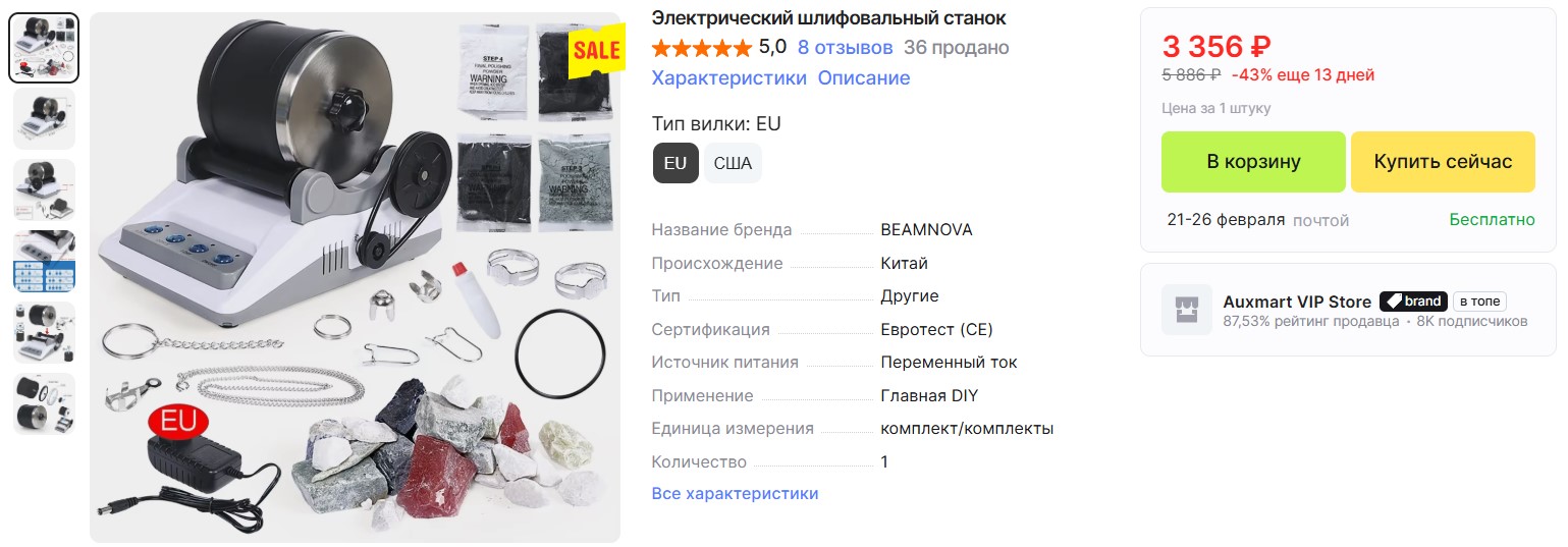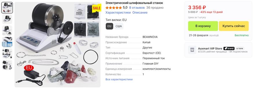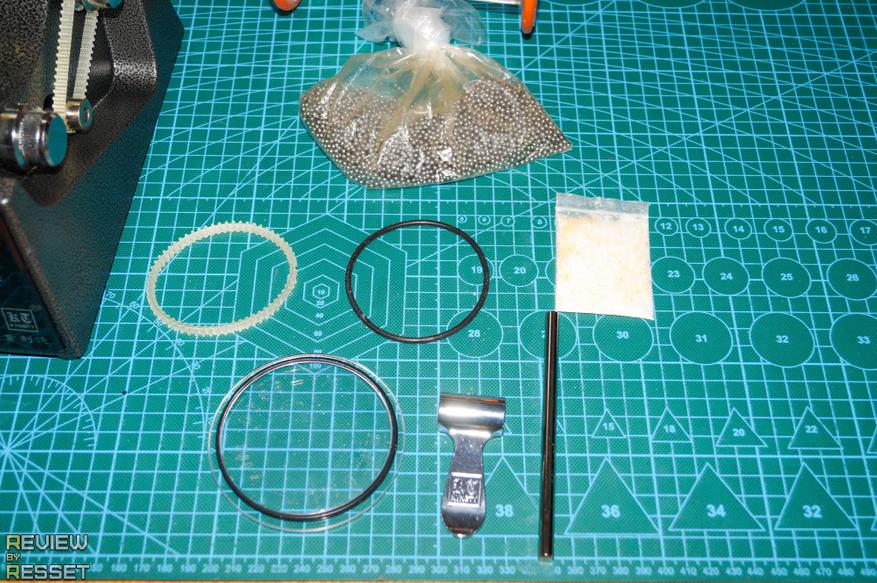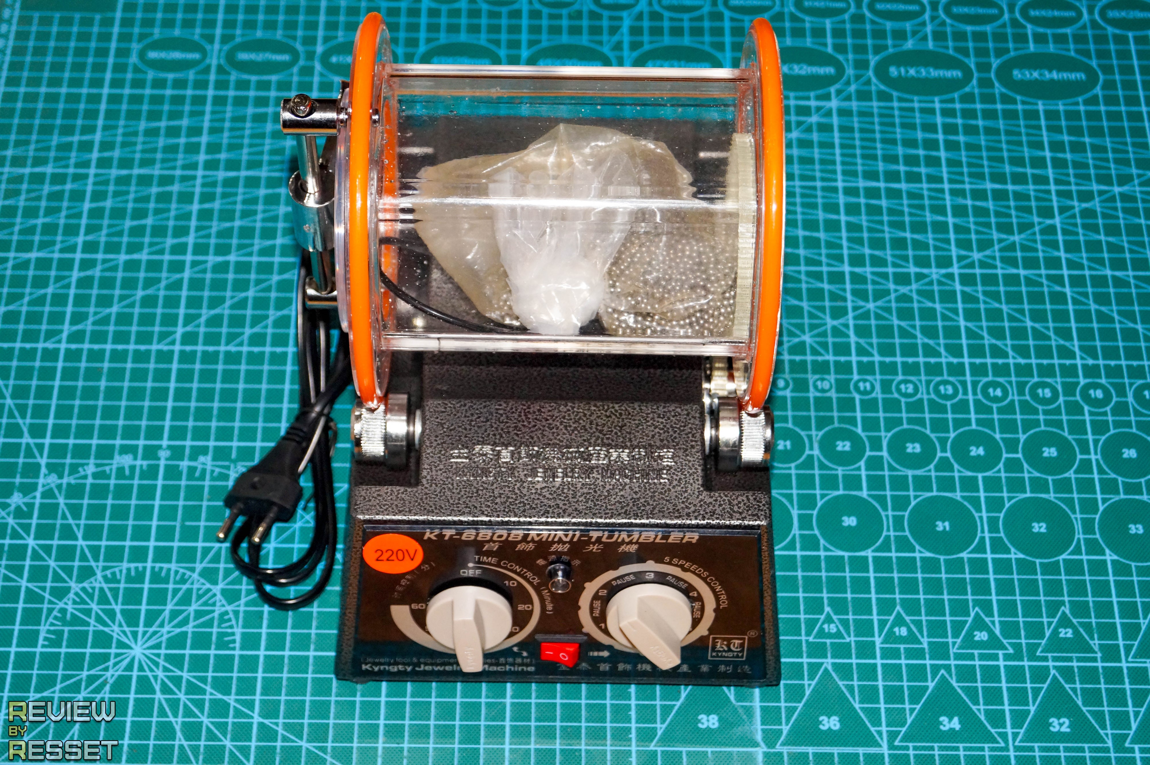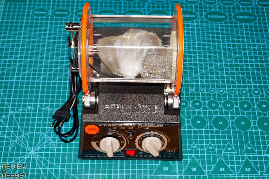 Данный инструмент позволяет полировать объекты длиной до 15 см без участия пользователя. Достаточно насыпать абразив, опционально чистящий состав с водой или другой жидкостью, закинуть детали и запустить очистку. Время воздействия можно выставить до 60 минут, либо бесконечность, есть 5 ступеней скорости вращения, а так же автоматический реверс для более равномерной обработки.