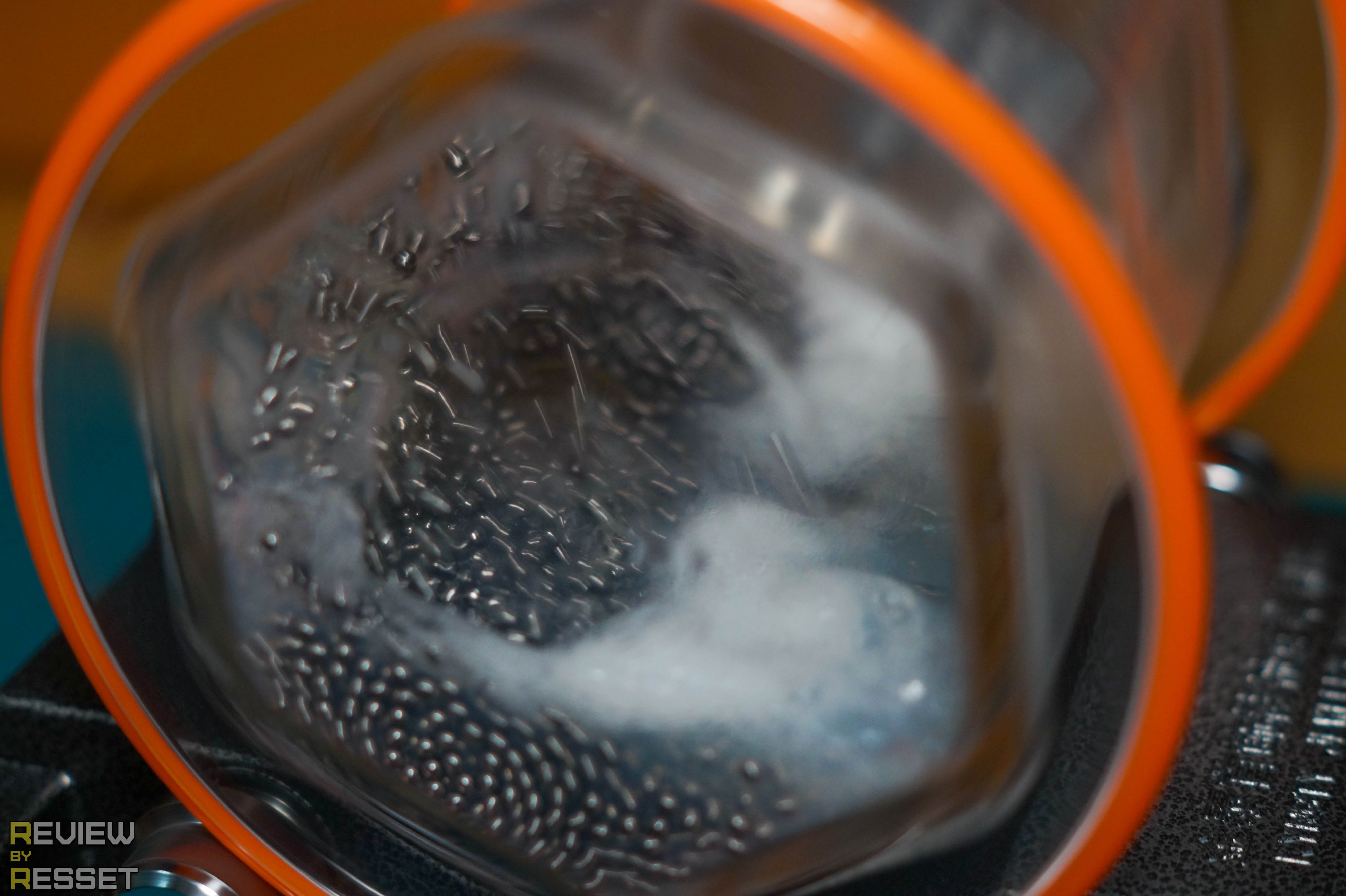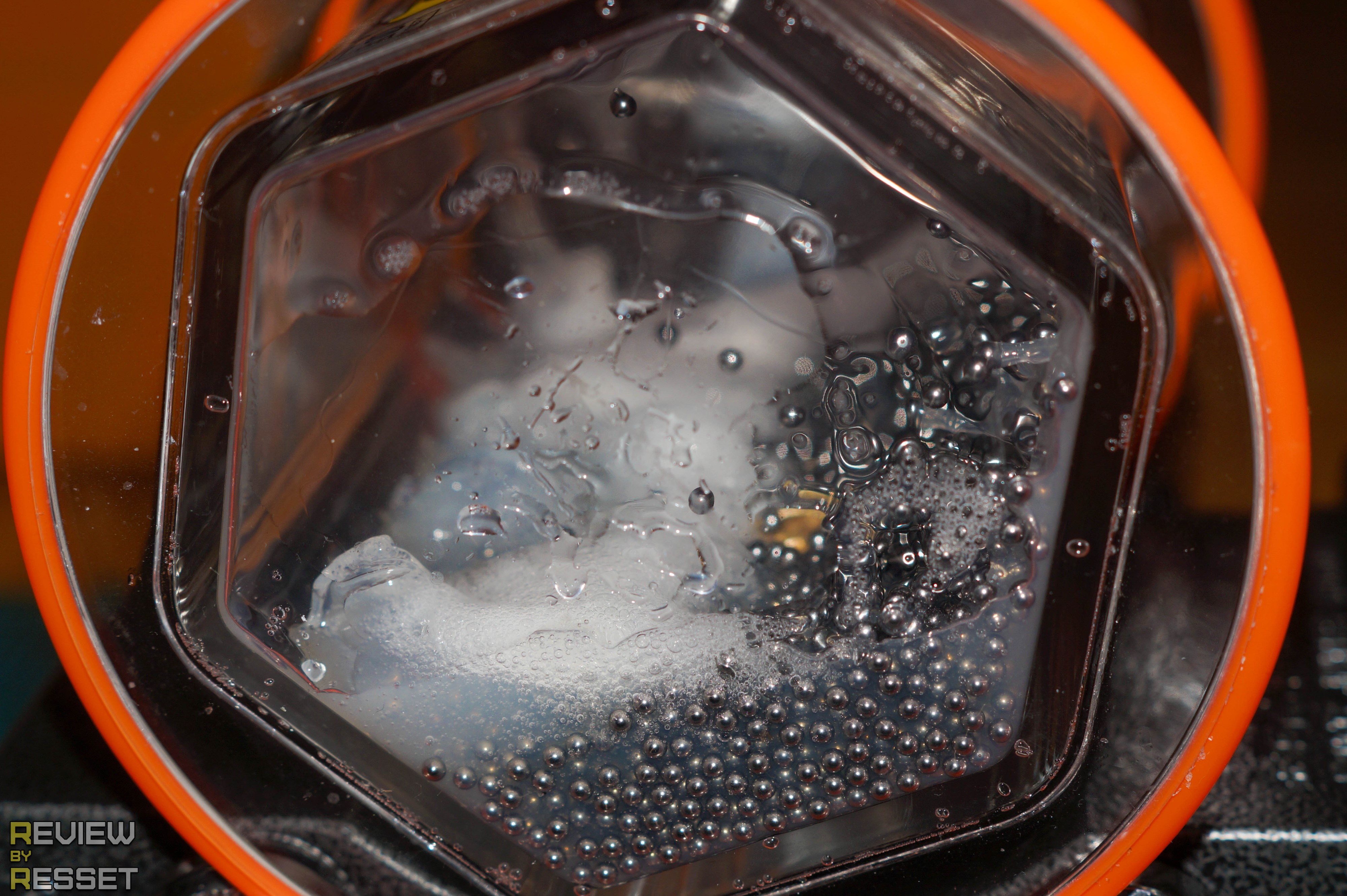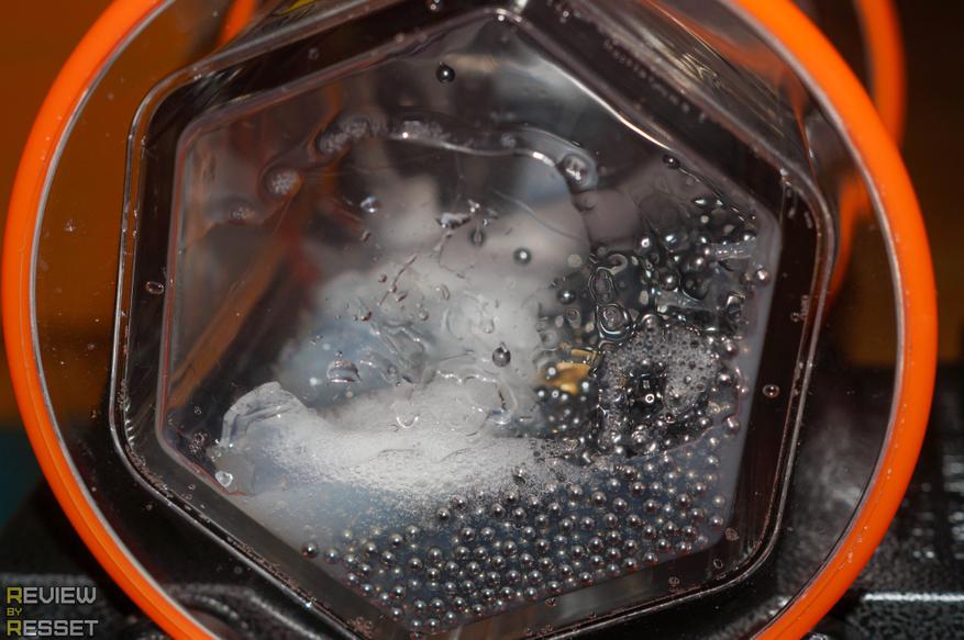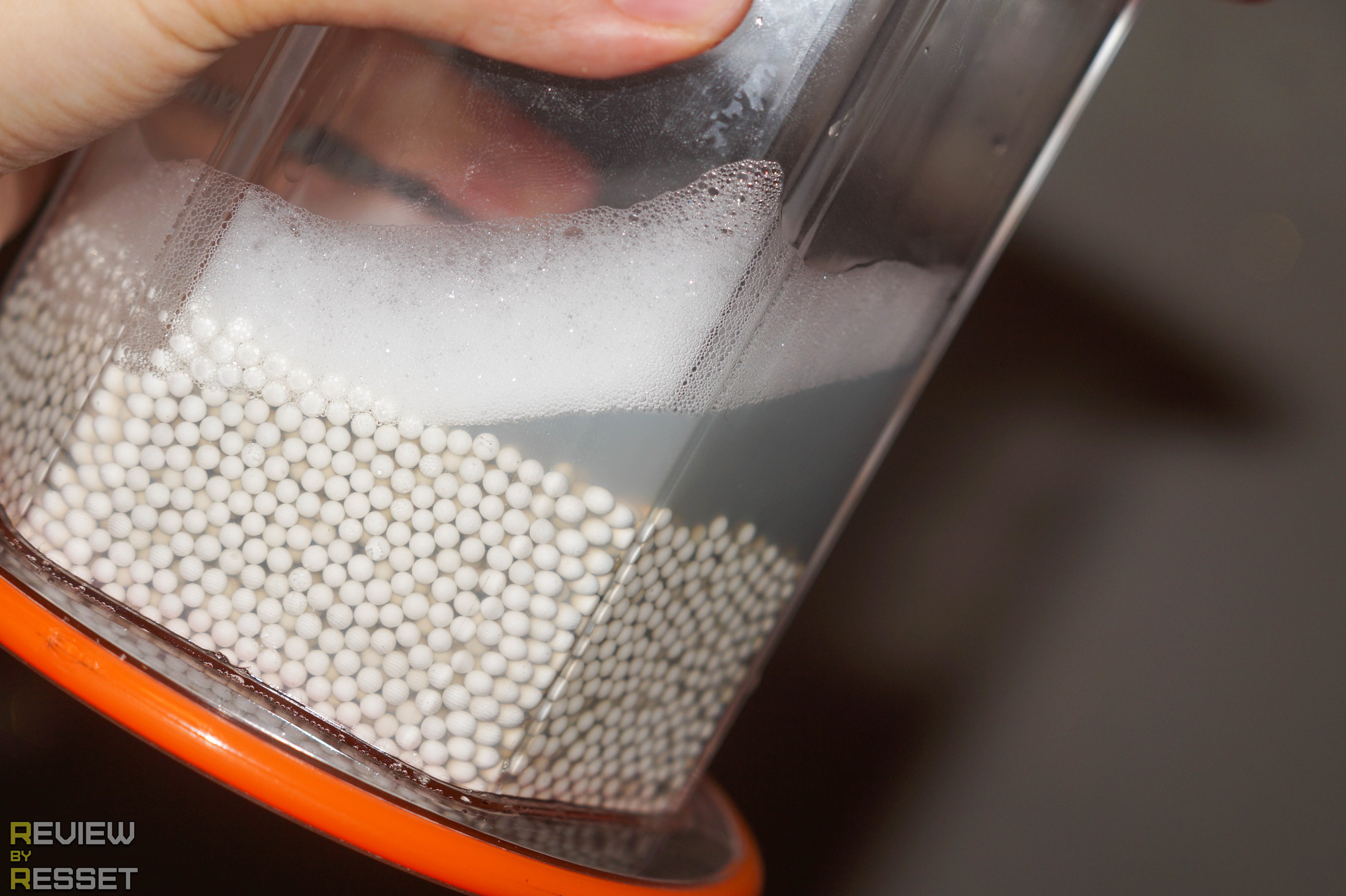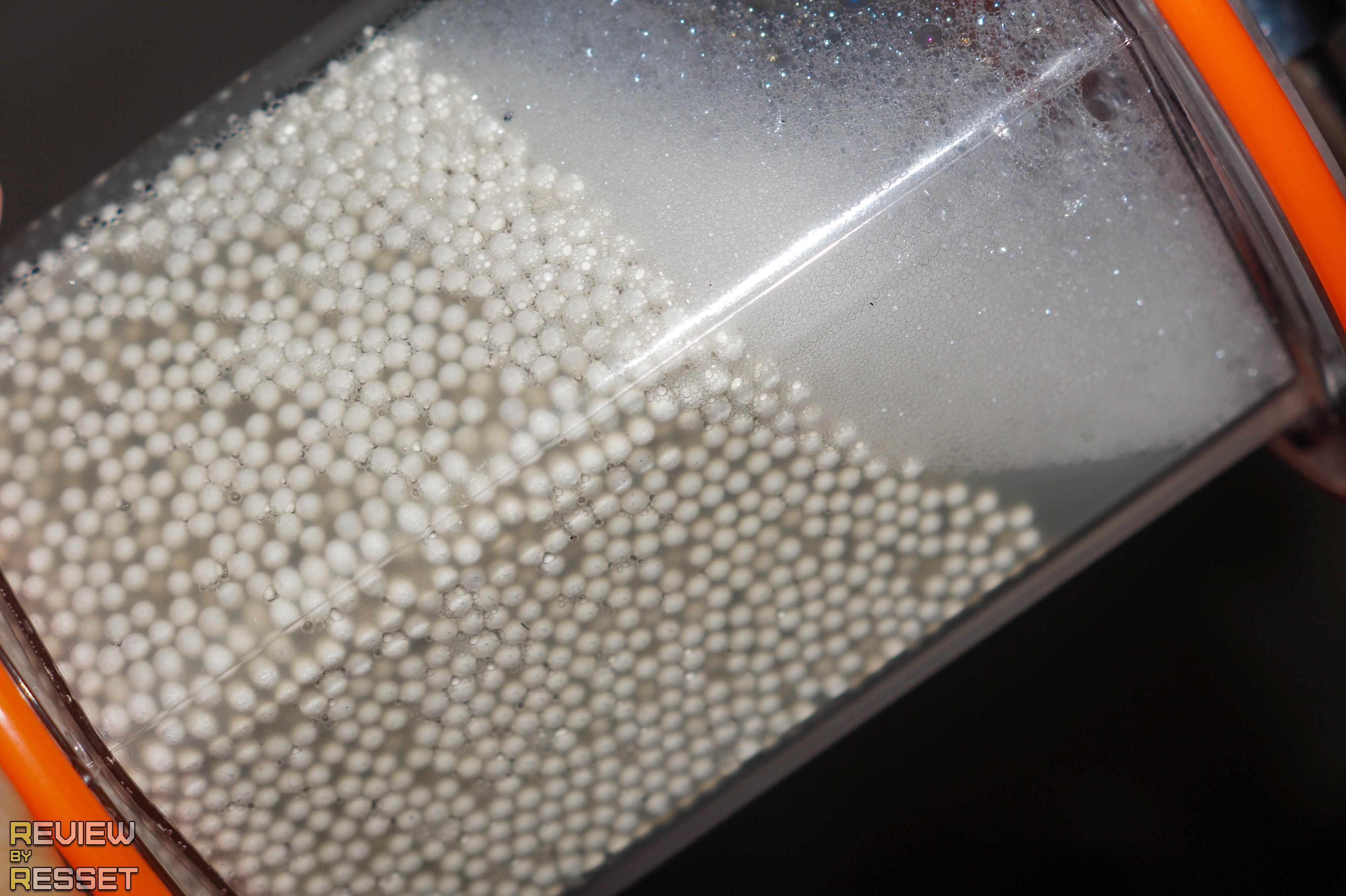 Закинул для начала абразивные белые шары и поставил таймер на 60 минут. После остановки вода была, мягко говоря, грязная.