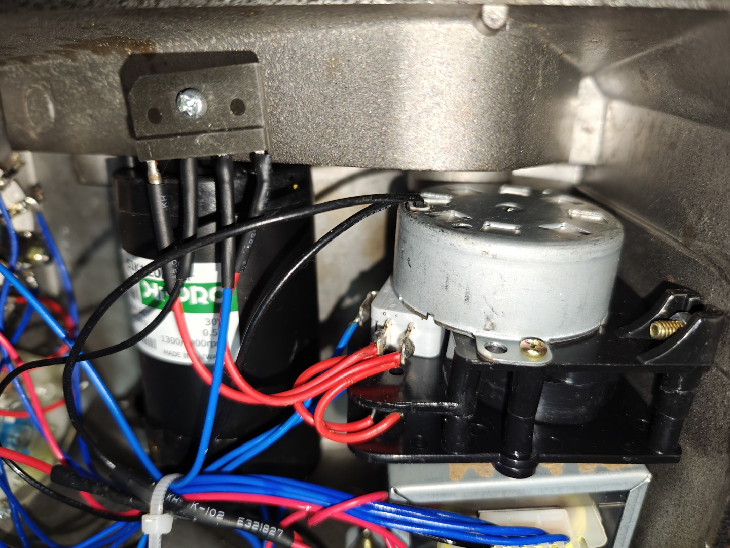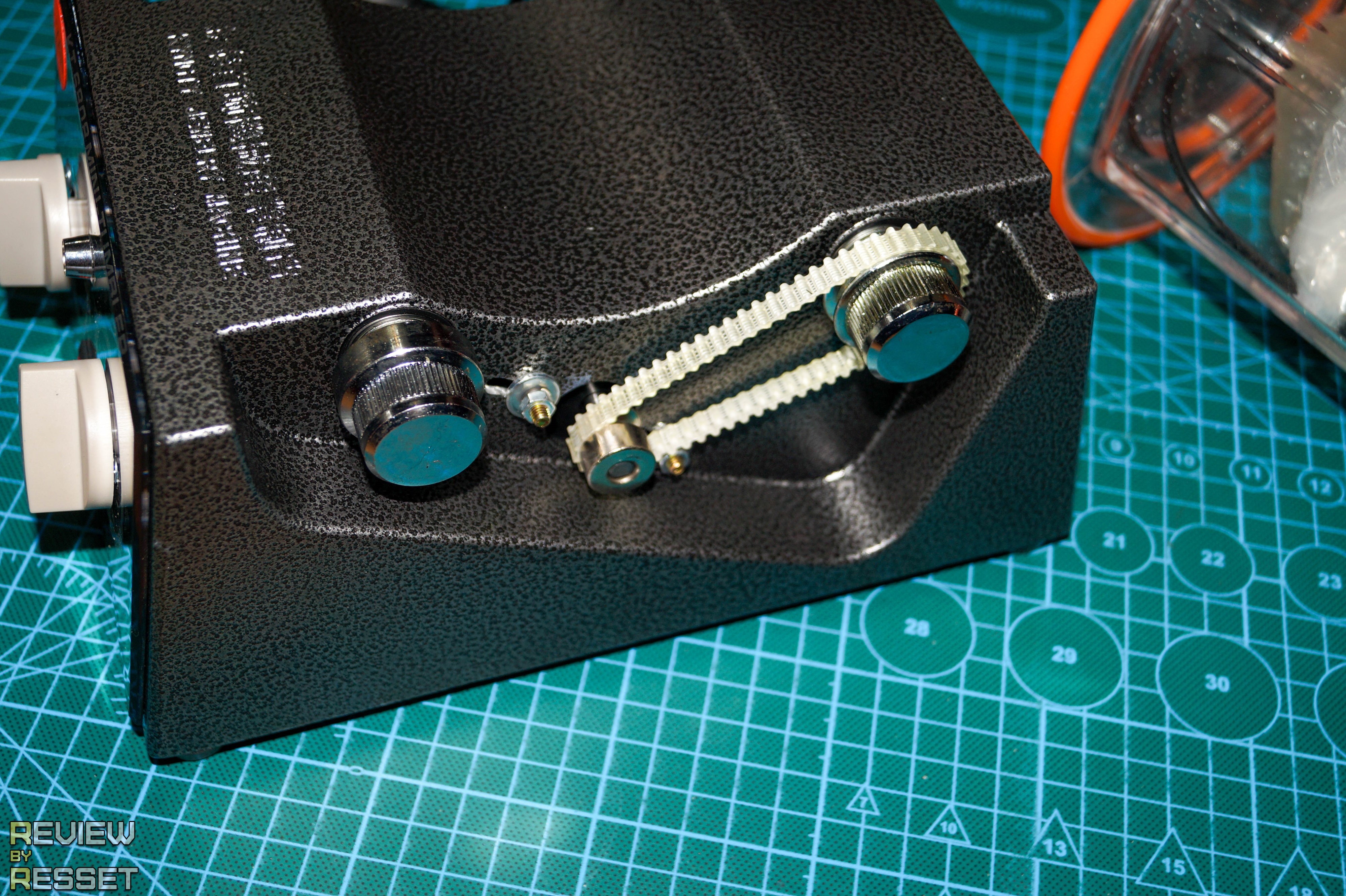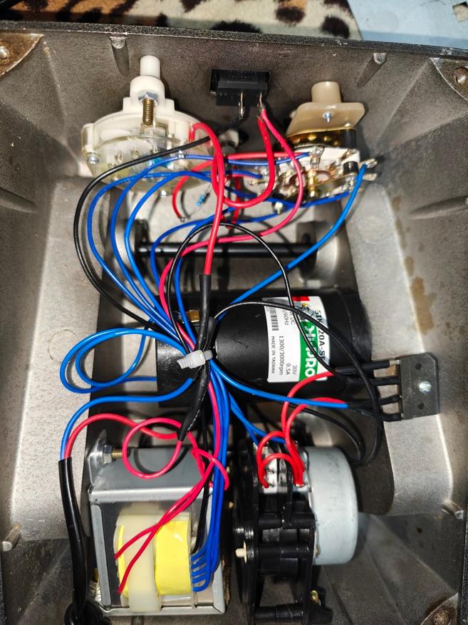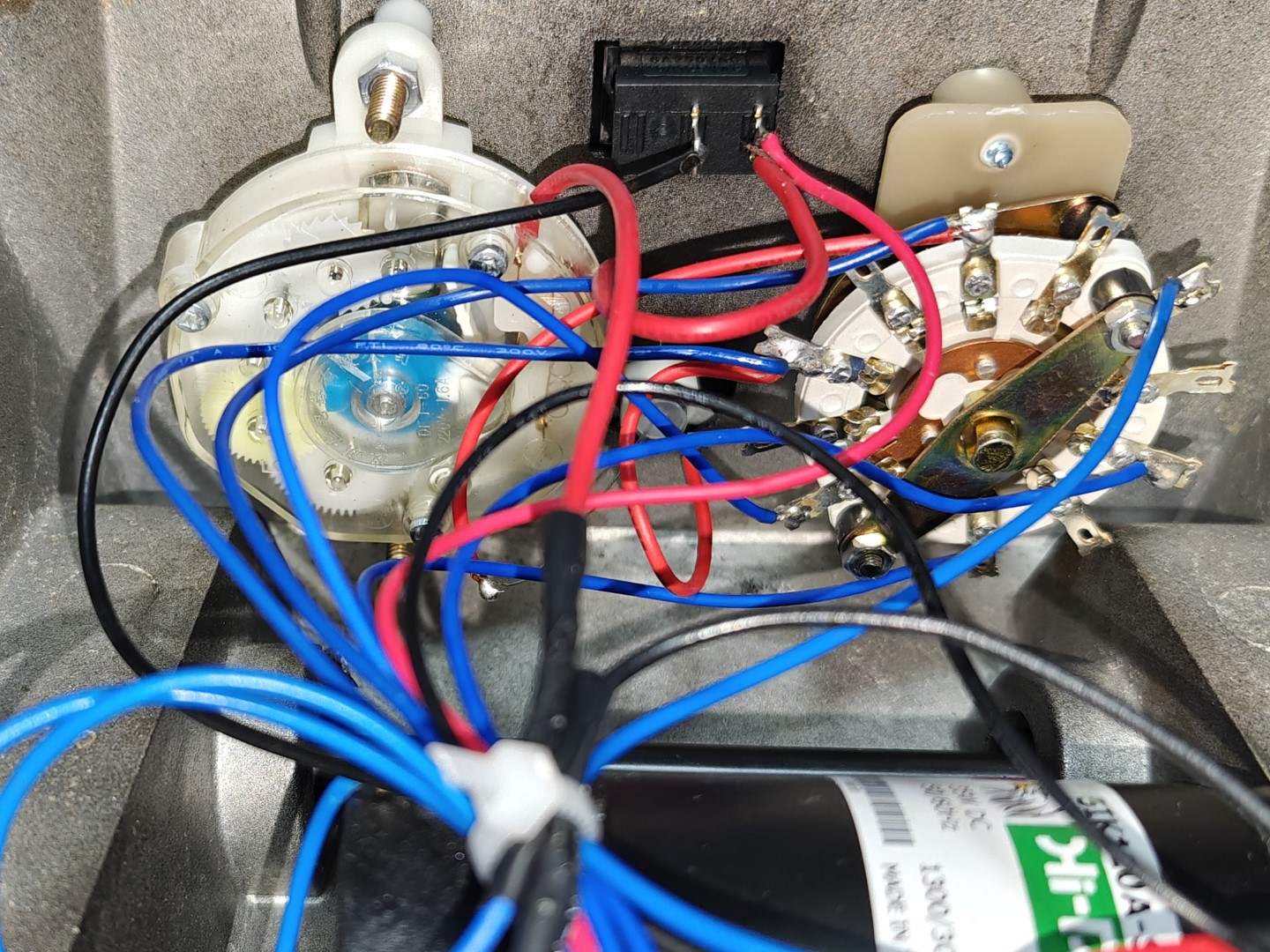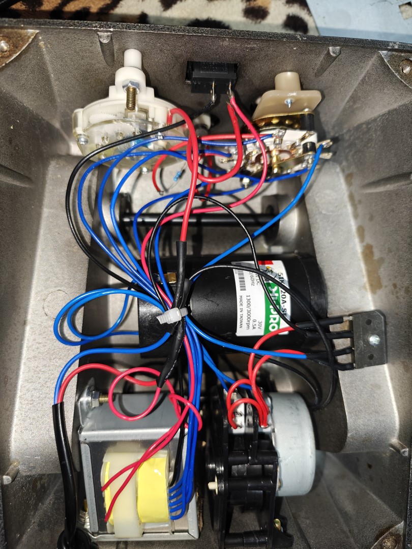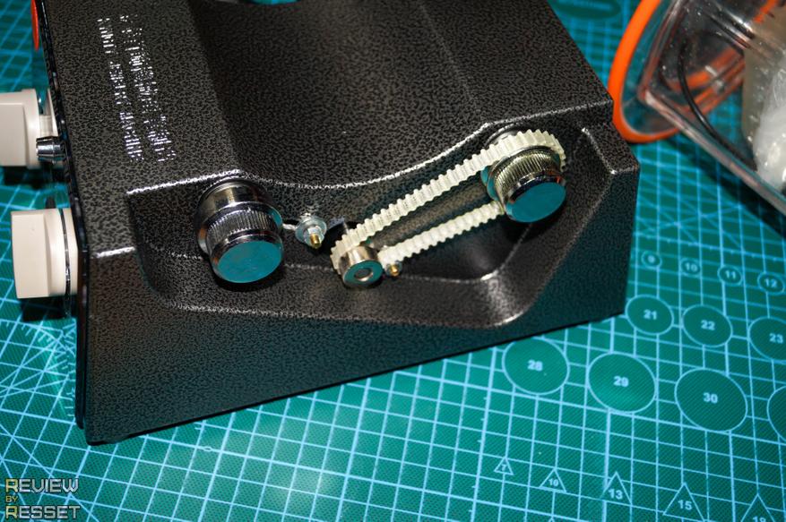 Управление напоминает стиральную машинку. Левой крутилкой задается время, правой интенсивность перемешивания, между основными положениями есть зоны паузы. Шкив двигателя находится справа, он соединяется ремнем с задним роликом, который находится на одном валу с левым, передние свободно вращаются. Имеется и механизм натяжки, который фиксируется гайкой.