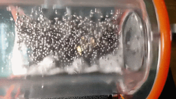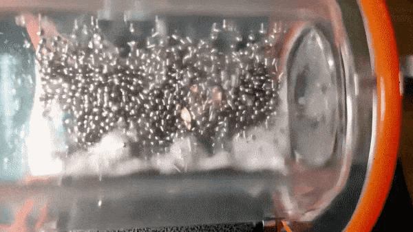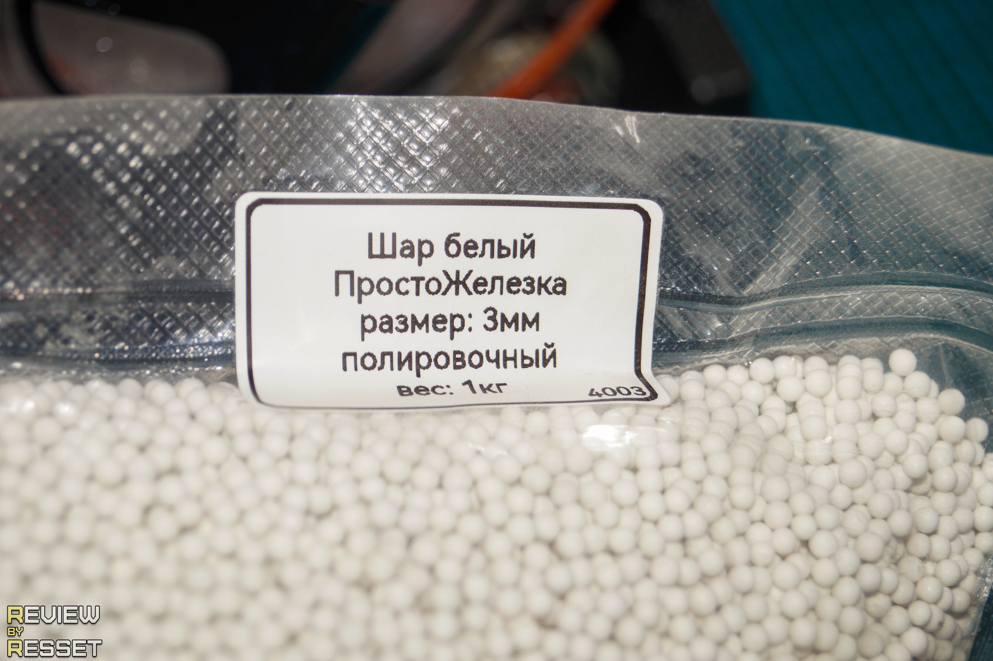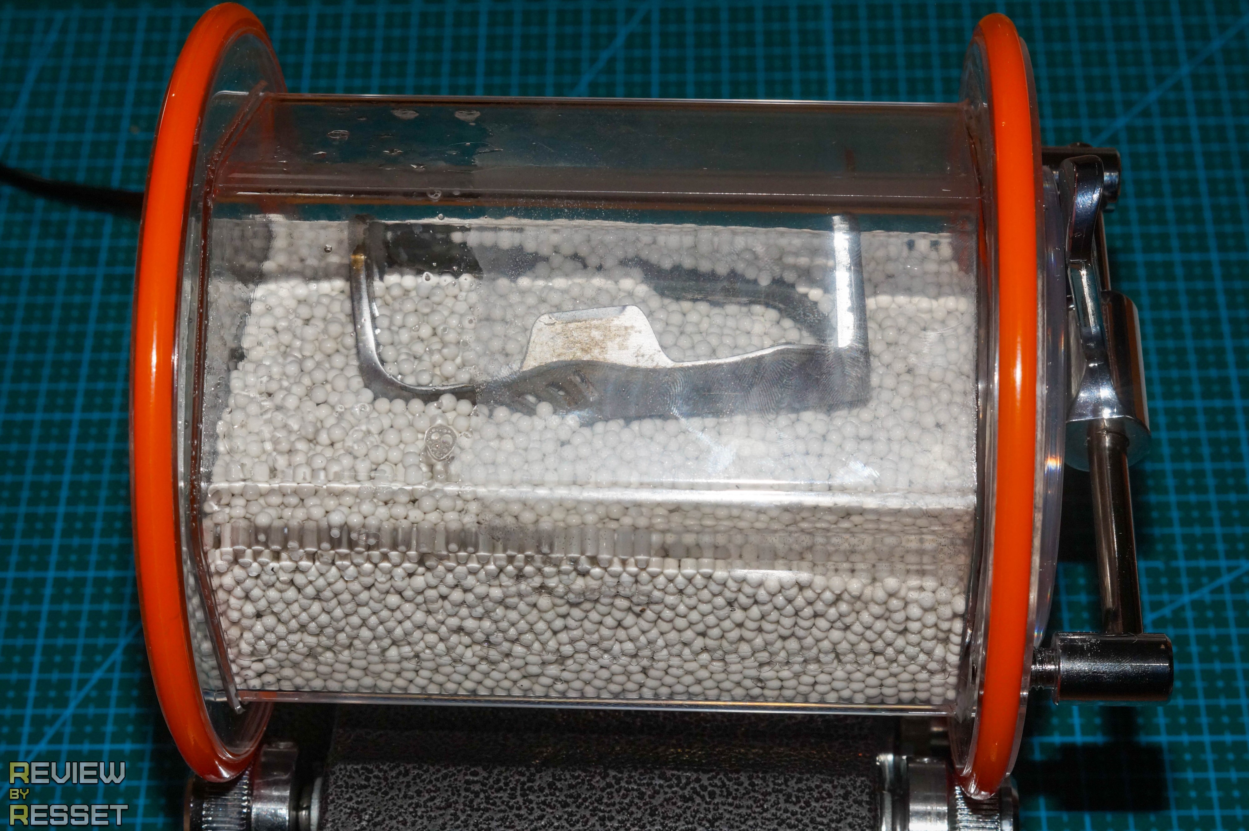 Тут нужно либо оставлять на ночь, либо использовать более грубый абразив. Оставил обрабатываться на час. На замедленном видео можно понять, что деталь не только катается по нижнему слою, но её еще и осыпает шариками.