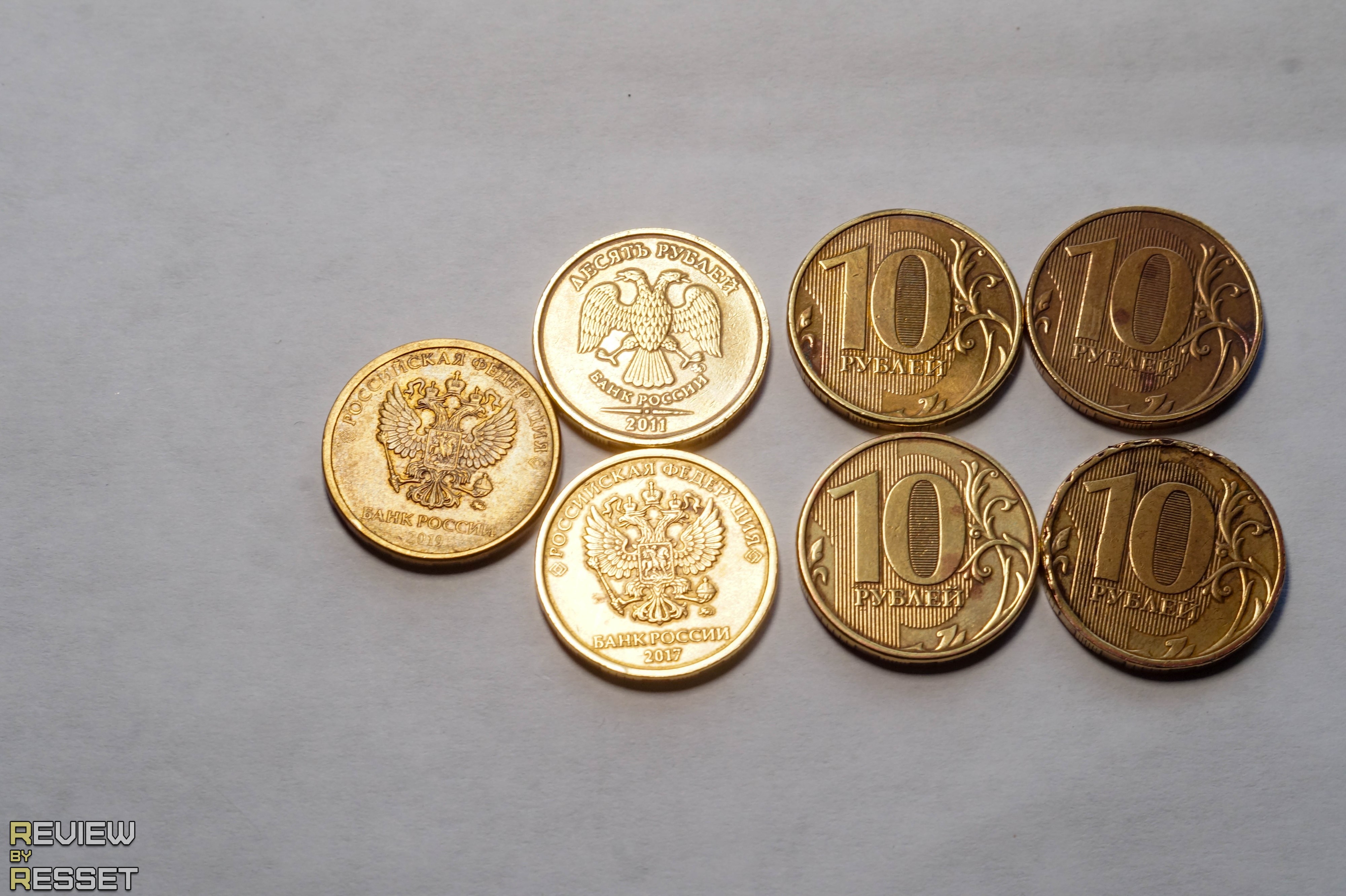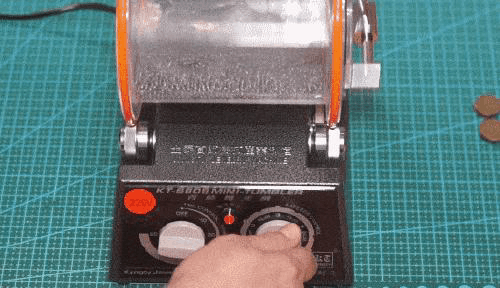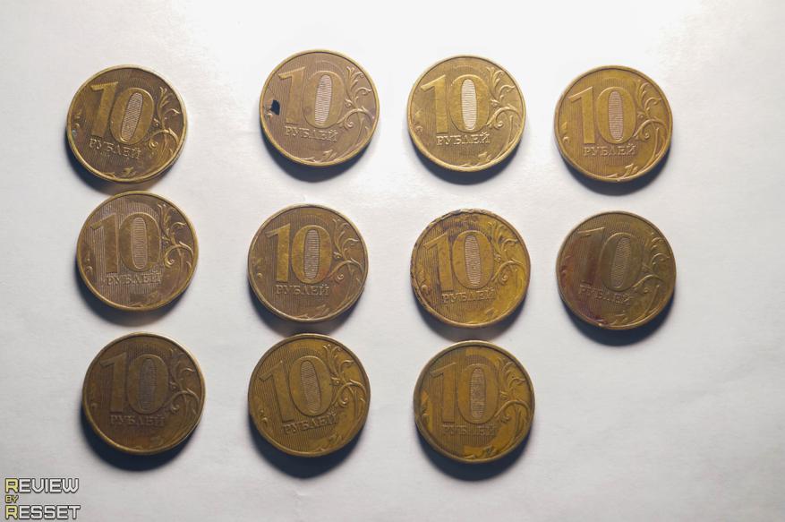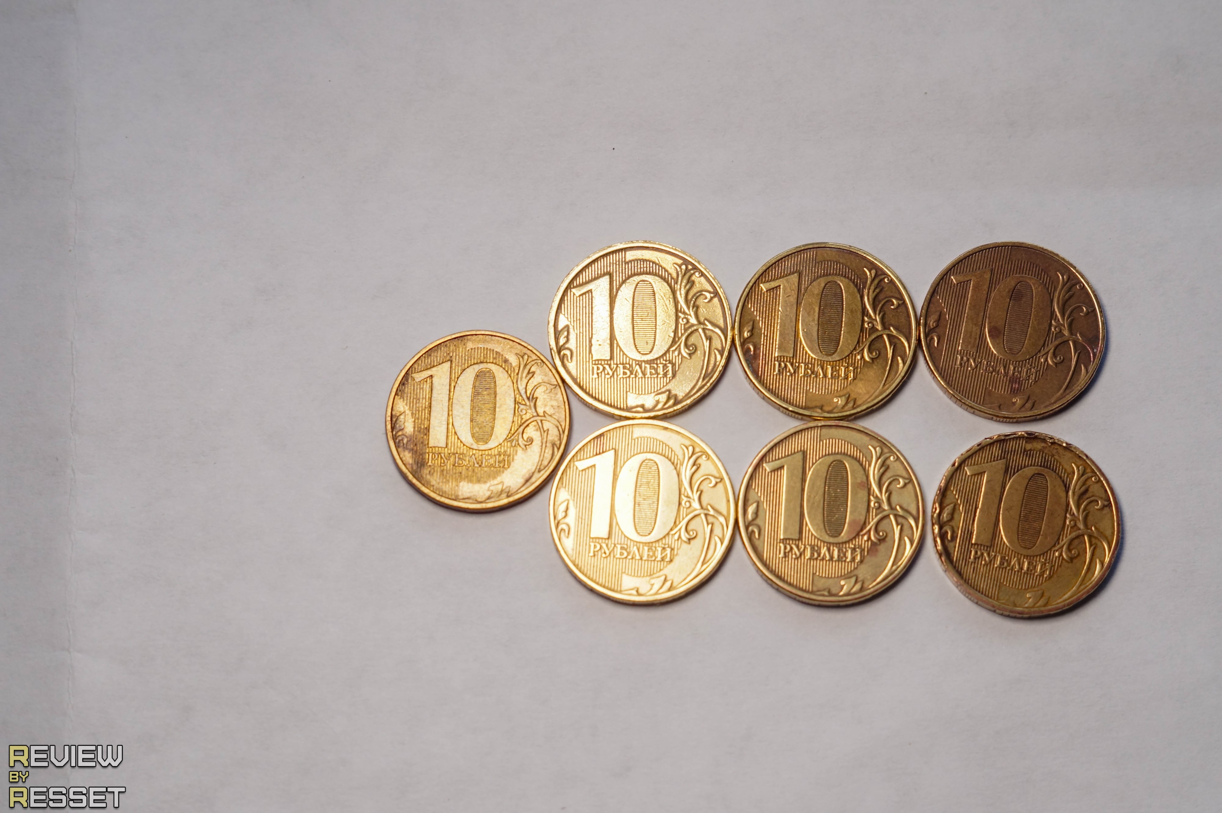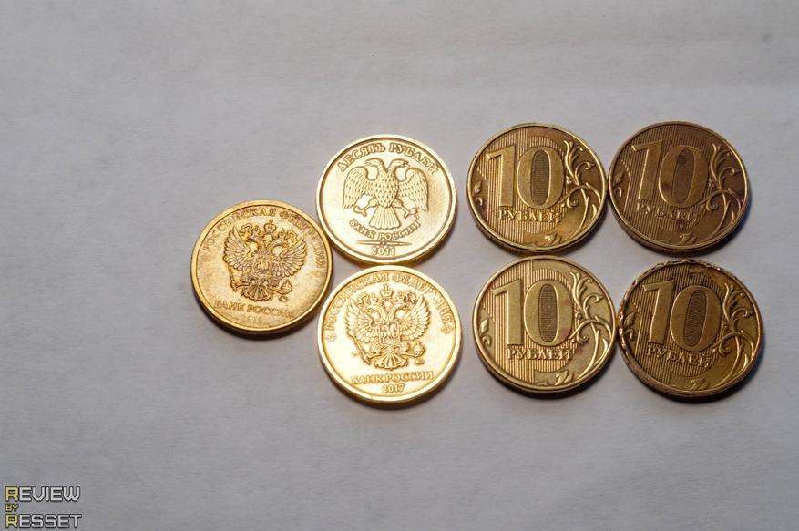 Закинул три штуки, весь пакет стальных шариков, воды, чтобы ей уровень был немного выше абразива и на кончике ложки порошка из комплектного пакета. Повернул левую крутилку на час, и проворачивая правую остановился на 3 скорости. Если ставить ниже, перемешивание идет вяло, а выше монеты начинает прижимать к стенке.
