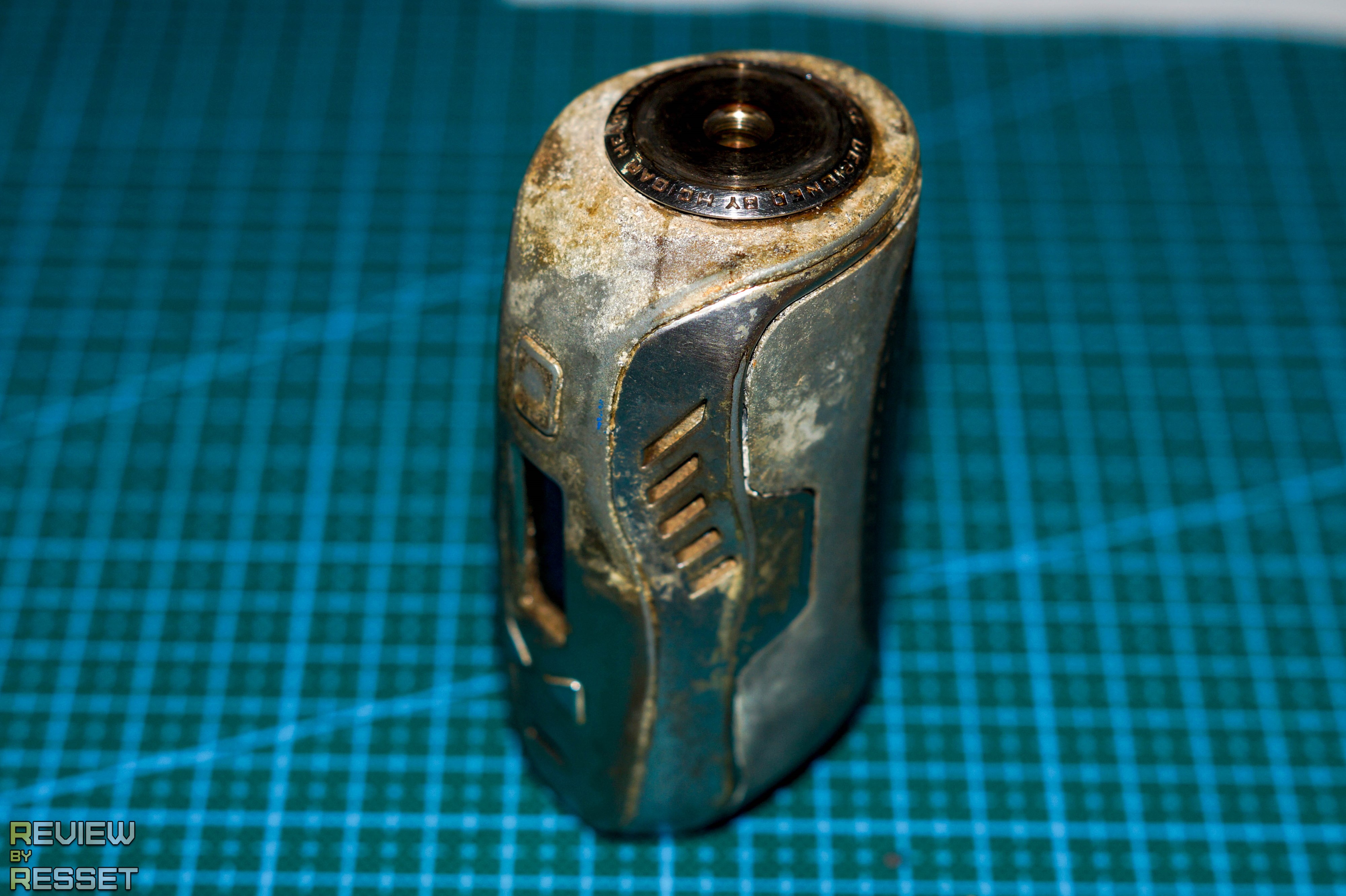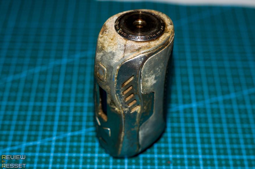 Я бросил курить 6 лет назад, слазил с обычных сигарет электронными и остался вот такой артефакт, который жалко было выкидывать, т.к. стоил этот боксмод в своё время не мало. Несмотря на то, что атомайзер казался пустым, со временем остатки жижи с него просочились на корпус и сотворили вот такое.
