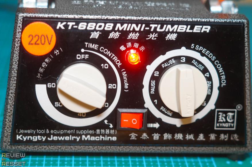 После поворота крутилки таймера включается красный светодиод и запускается двигатель. Центральный выключатель активирует периодическую смену вращения барабана для более равномерного воздействия на обрабатываемые детали.