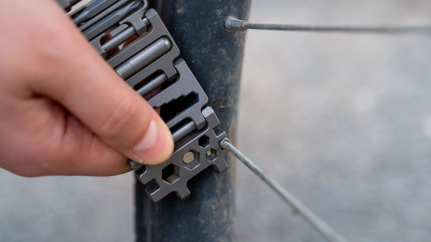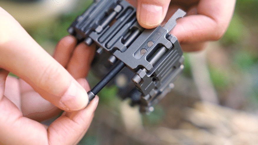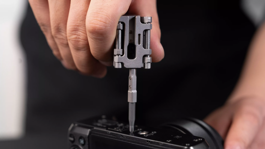 Конструкция TiLink собрана из отдельных металлических звеньев, соединенных между собой болтовыми креплениями. Каждое звено предназначено для определенной задачи, а общий набор насчитывает 24 инструмента. Основная версия выполнена из титана Gr5, известного своей прочностью и стойкостью к коррозии и небольшой массой. Материал выбран с расчетом на длительное ношение и регулярное использование без потери эксплуатационных свойств.