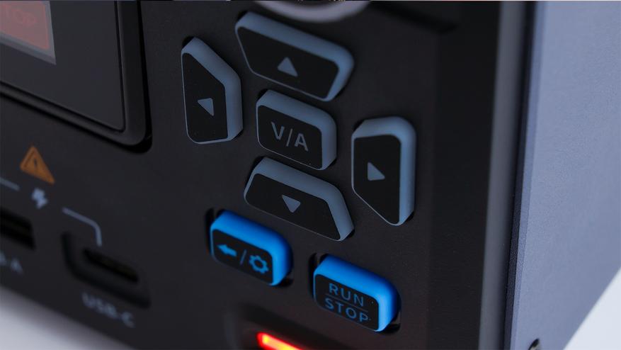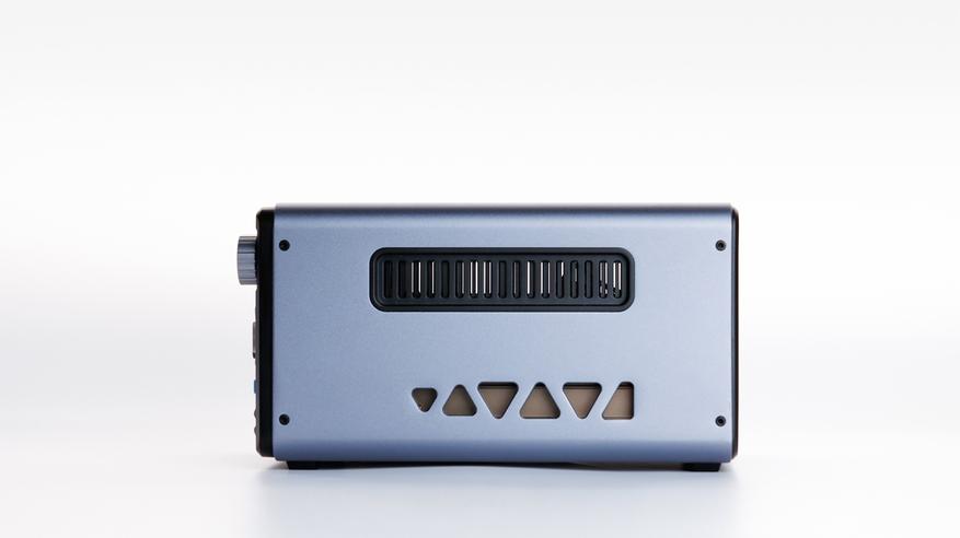 Спереди дисплей (с небольшим поворотом в вертикальной плоскости, чтобы было удобнее считывать показания), сгруппированные кнопки и энкодер управления и два разъема для быстрой зарядки смартфона и других портативных устройств (до 45 Вт на выходе с поддержкой протокола PD 3.0). Плюс наглядный вытянутый индикатор работы (красный/зеленый цвет).