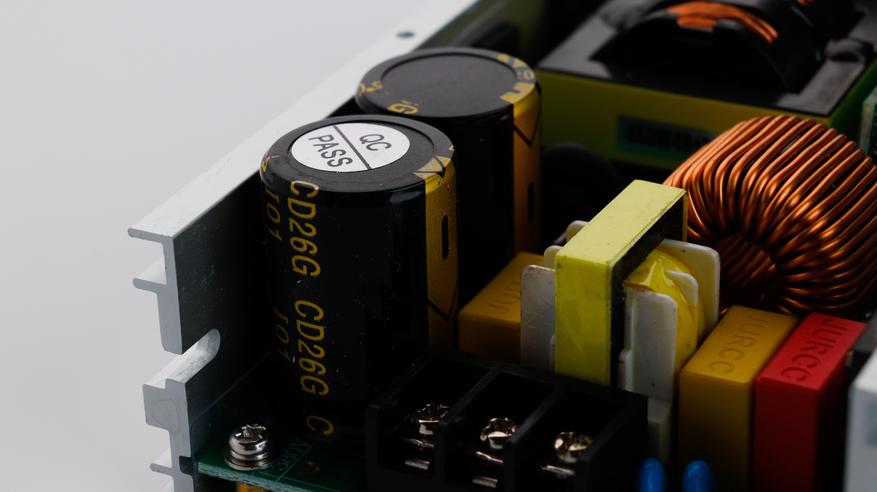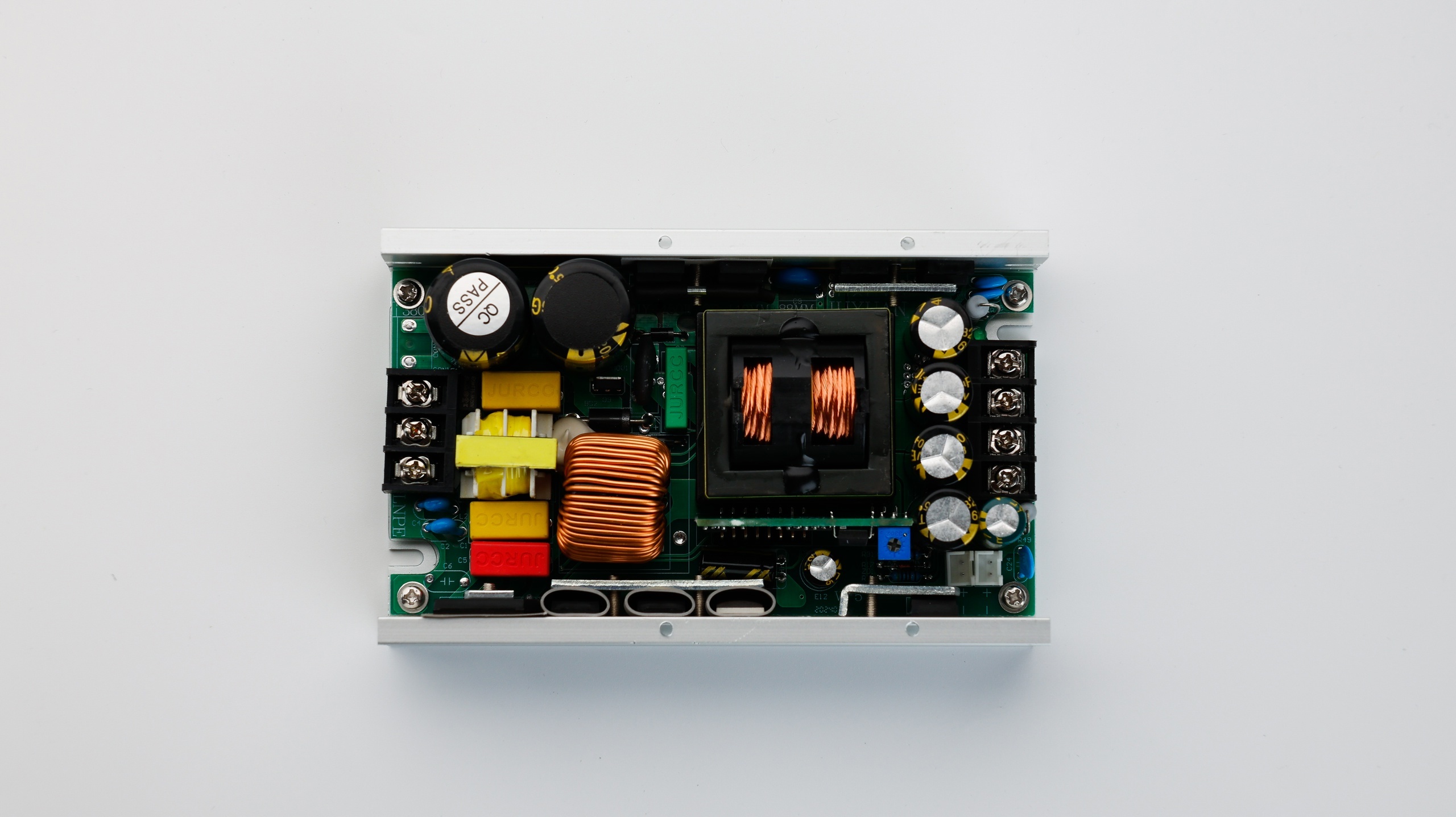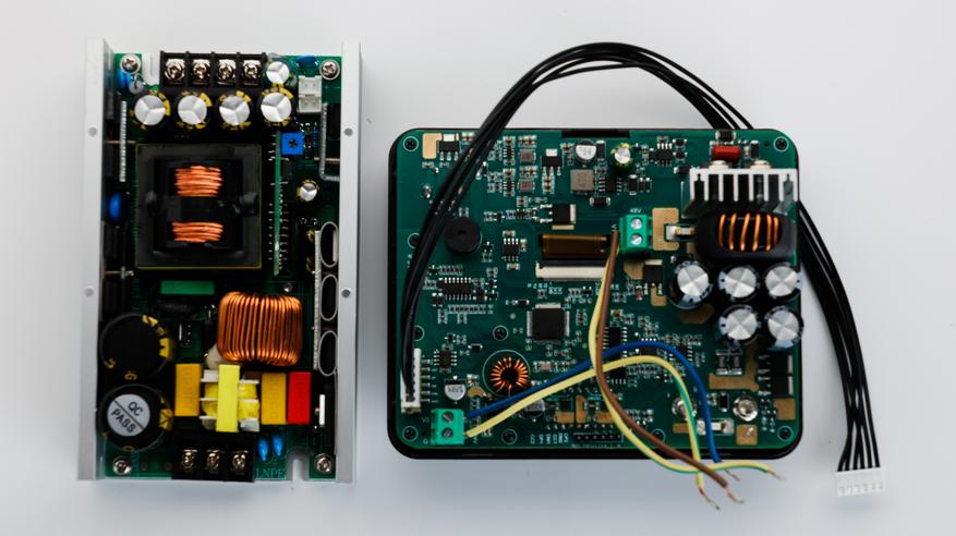 Плата блока питания (выход 48 В) оснащена алюминиевым корытообразным радиатором, сетевым фильтром, выходные электролиты с запасом по напряжению. На вид мощность блока питания выше возможностей всего БП (285 Вт) + зарядка 45 Вт. Увидеть там силовой трансформатор на 50 Гц было бы странно, современные лабораторные блоки имеют импульсное силовое питание (это дешевле, легче, нет наводок и точно не хуже в качестве выходного напряжения).