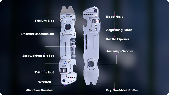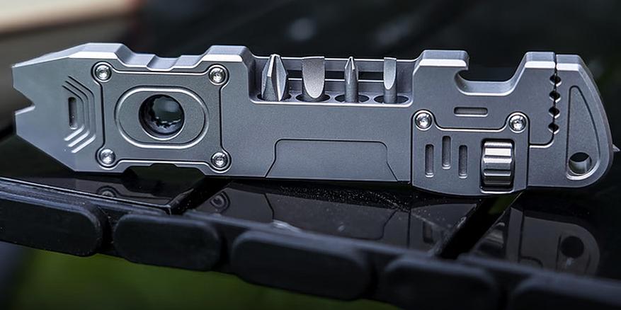 На корпусе вытянутой формы с одного конца клиновая монтировка с гвоздодером (которой также можно открывать коробки), с другой — разводной ключ, на торце которого встроен аварийный стеклобой из закаленной стали. Биты с хвостовиком 1/4″ удерживаются в пазах магнитами. Не забыта и классика — открывалка для бутылок.