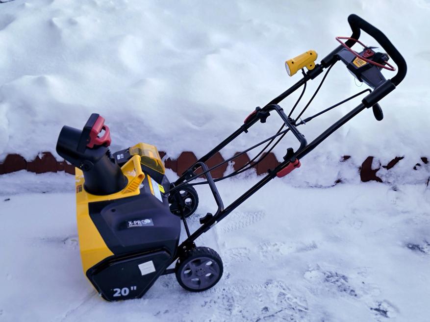 Колеса — пластиковые, снегоочиститель не самоходный — нужно толкать самостоятельно. Предусмотрен светодиодный курсовой фонарик для работы по вечерам. Ручка без подогрева.