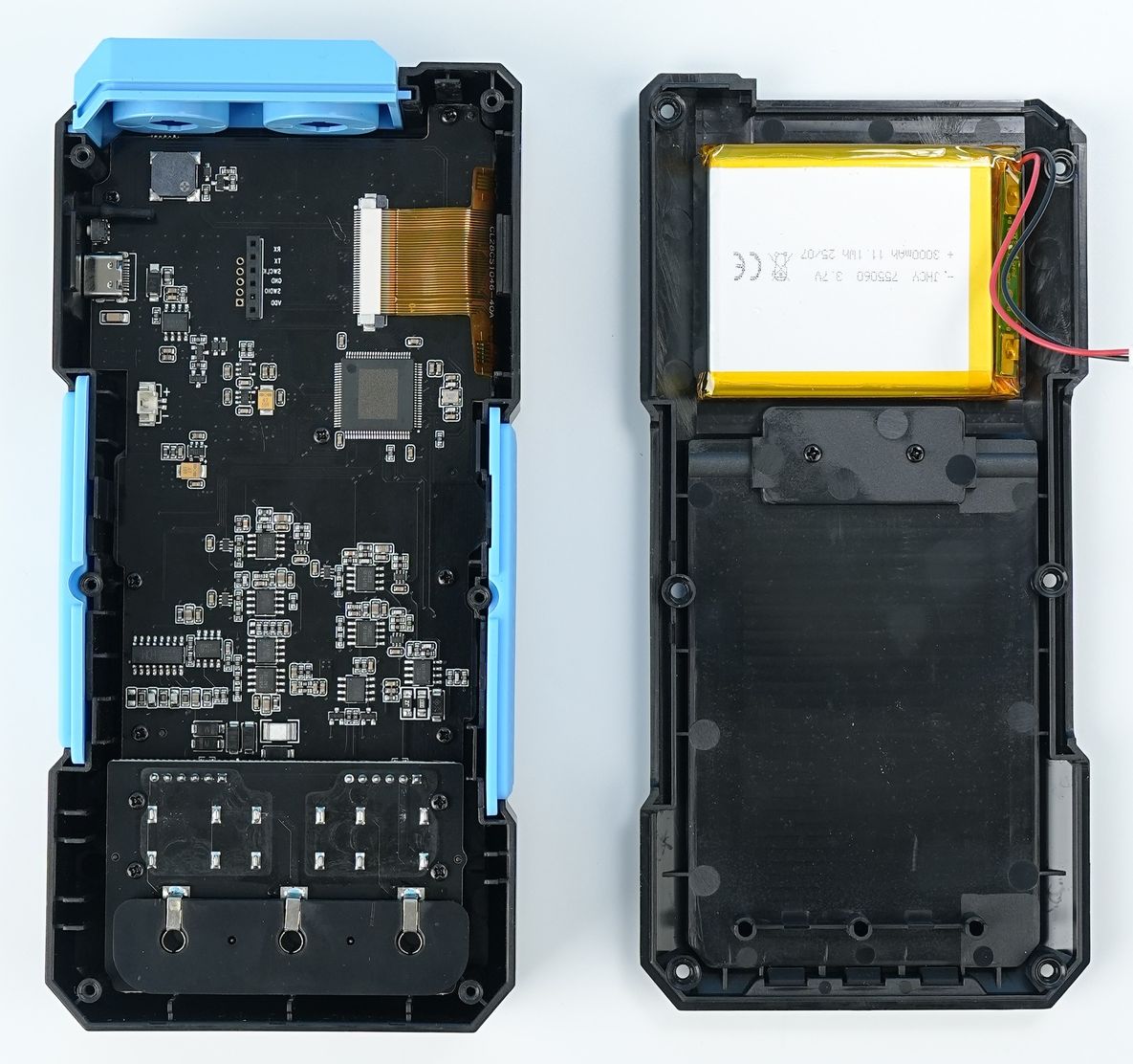 Прибор выполнен в форм-факторе мультиметра, для работы на столе есть подставка. Компоновка типовая — сверху экран, по центру сгруппированные кнопки, снизу терминалы для щупов. Зарядный порт справа под защитной заглушкой. Индикатор заряда выведен на кнопку включения.