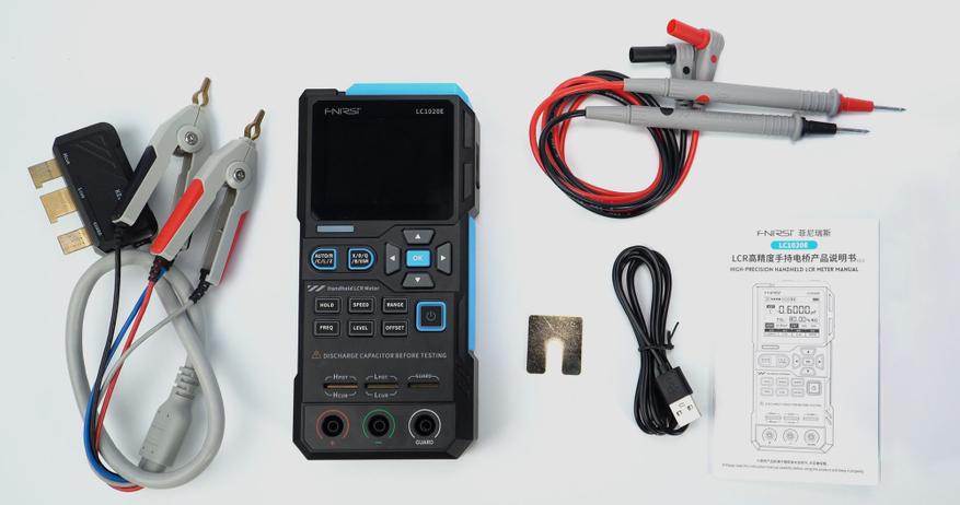 С прибором LC1020E поставляется: обычные щупы с иглами (как у классического мультиметра), шупы Кельвина с отдельным блоком для четырехпроводной схемы, кабель USB для зарядки и соединения с компьютером, пластина для калибровки, инструкция на китайском и английском языках.