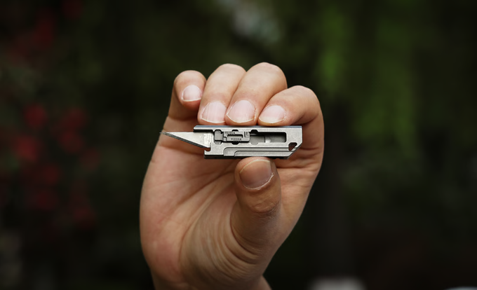 Внутри мультитула помещается выдвижное съёмное лезвие скальпеля. В зависимости от сценария применения производитель предлагает два уровня выдвижение последнего. Если требуется открыть коробку и просто разрезать скотч или транспортировочную плёнку, то лезвие выдвигается на минимальную длину. На полную же длину оно выдвигается в случаях, когда необходимо разрезать что-то небольшое или, к примеру, снять изоляцию с провода или заточить карандаш.