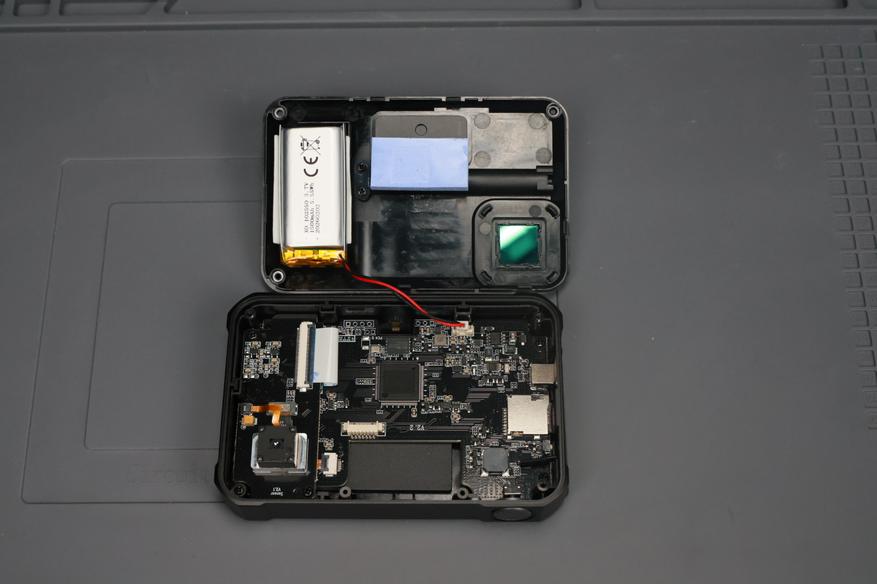 На лицевой стороне расположен модуль тепловизора, площадка, на которую удобно класть пальцы и откидная ножка, видимо чтобы удобнее было просматривать результаты съемки. На верхней грани находится кнопка «ОК», которая используется для управления в меню и сохранения снимков. Большую часть задней стороны занимает сенсорный дисплей и три кнопки под ним. Еще одна физическая кнопка расположена в правом верхнем углу и служит для выключения/включения питания.