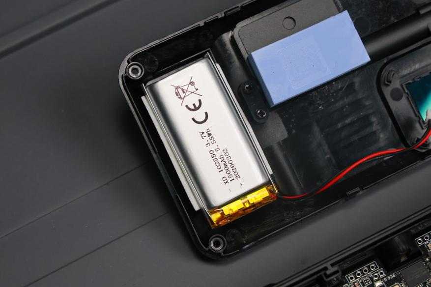 Корпус разбирается легко. Ёмкость аккумулятора 1500мАч, имеется теплоотвод с контроллера на корпус, но его маркировка затерта.