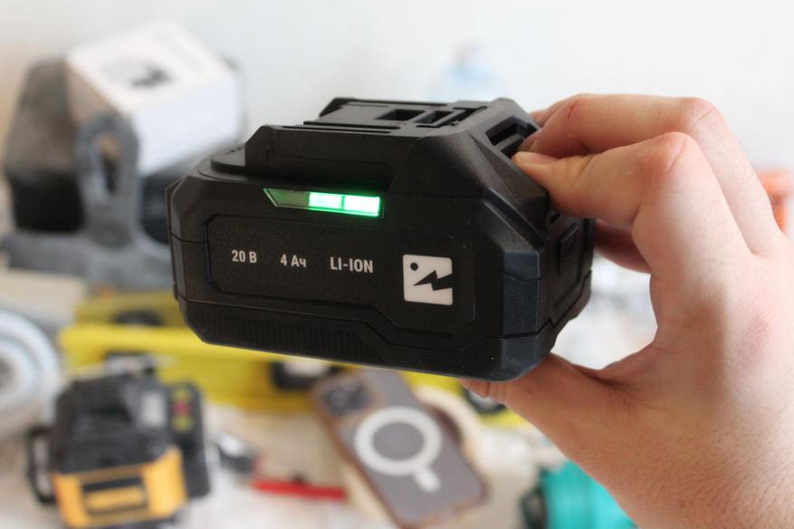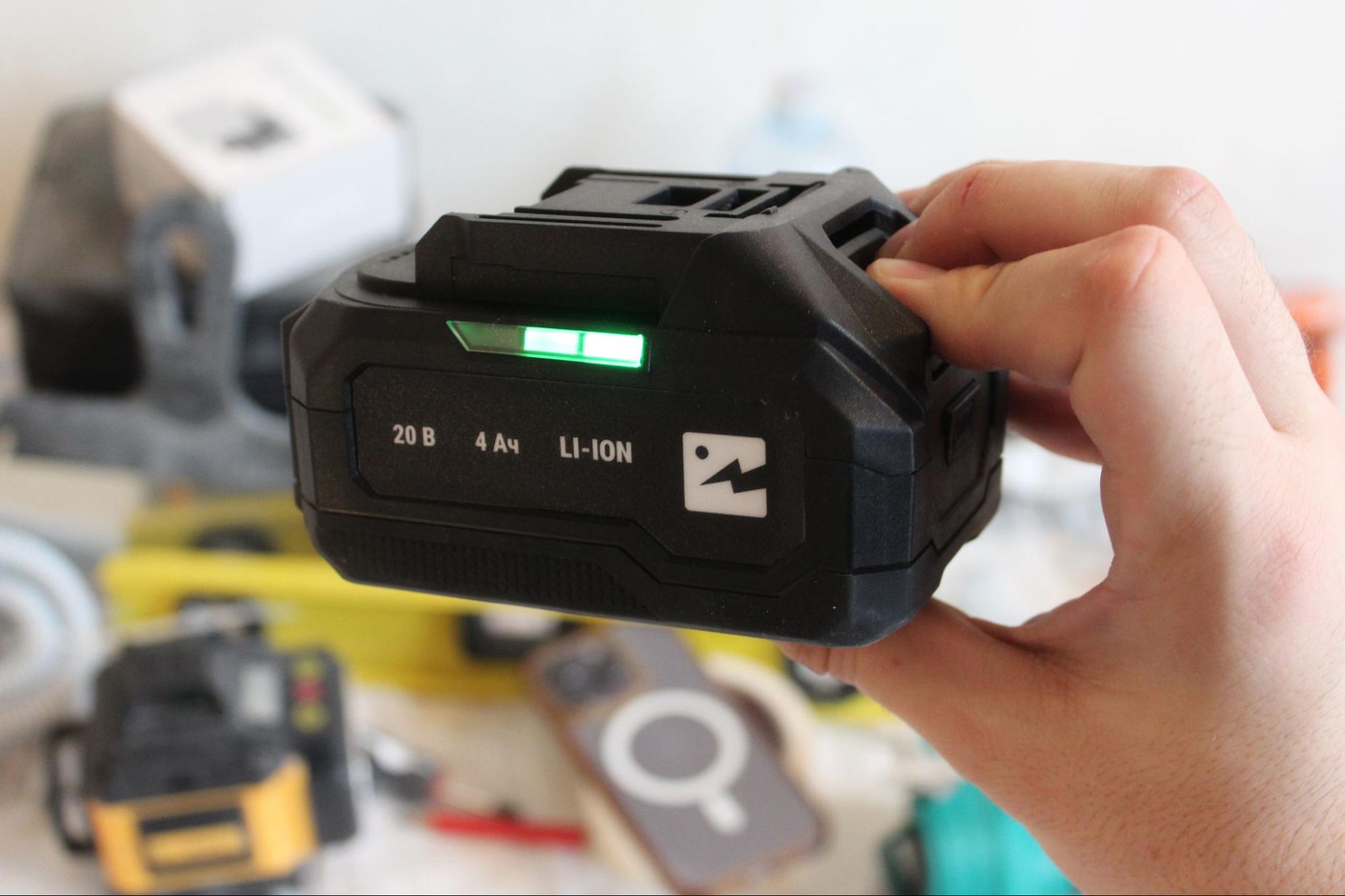 Сколько времени можно работать от одного аккумулятора? Это зависит от нагрузки. Аккумулятора емкостью 4 А·ч хватает на продолжительную сессию работы — например, на сборку крупного предмета мебели или шлифовку стены в средней по размеру комнате. Наличие второй батареи в комплекте полностью снимает вопрос автономности: пока одна работает, вторая заряжается.