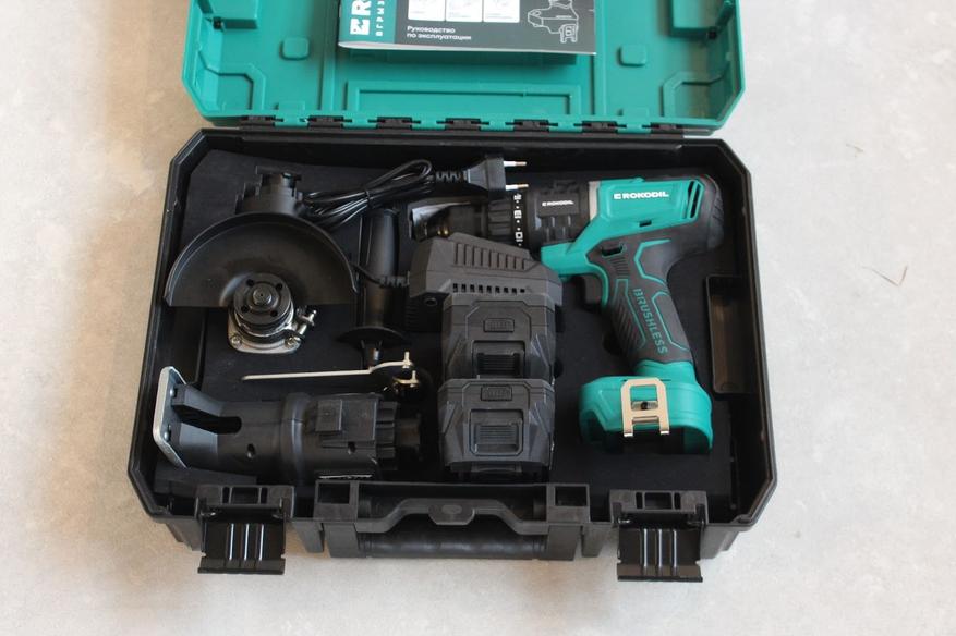 - Три сменных модуля: дрель-шуруповерт, лобзик и угловую шлифмашину.