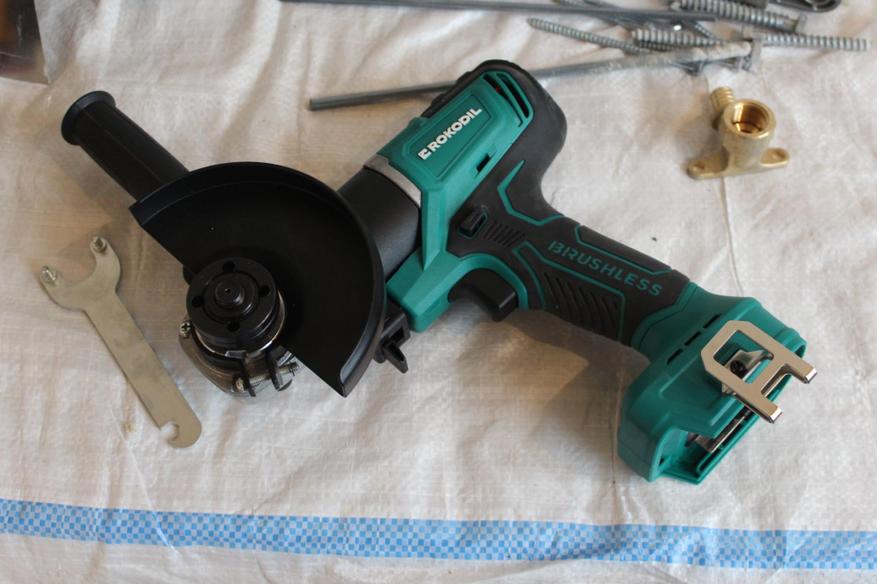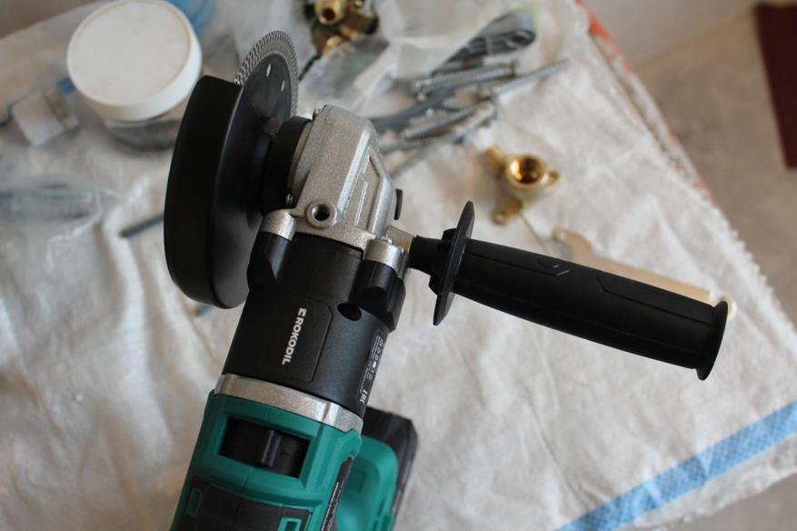 Изначально кажется, что болгарка в квартире — инструмент излишний. Но на практике ее применение оказалось шире, чем я предполагал. Модуль УШМ развивает скорость 8500 об/мин и совместим с дисками диаметром 115 и 125 мм. Корпус редуктора металлический, имеет три точки для крепления боковой ручки и кнопку блокировки шпинделя.