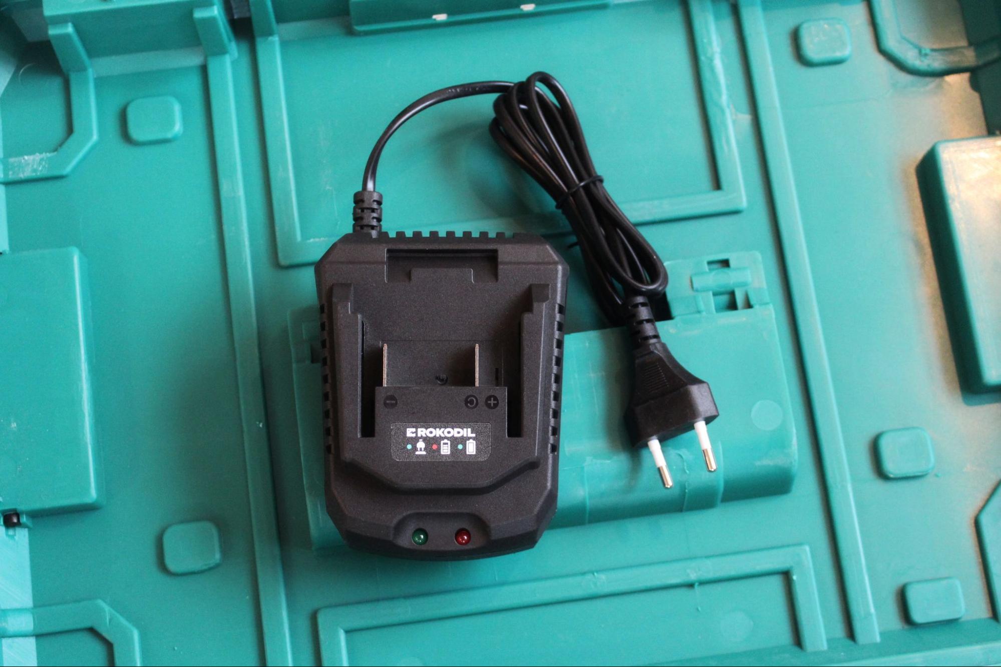 Rokodil Multivert Start комплектуется двумя аккумуляторами с байонетом, совместимым с платформой Makita. Обе батареи оснащены трехсегментным светодиодным индикатором остаточного заряда. Важно, что индикатор активируется сразу при установке аккумулятора в инструмент, позволяя всегда видеть уровень заряда. Для отдельной проверки на корпусе есть отдельная кнопка.